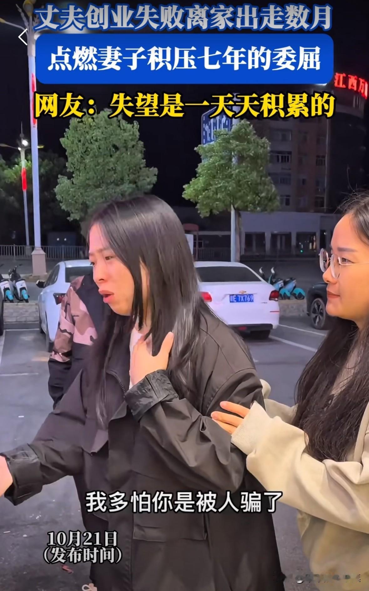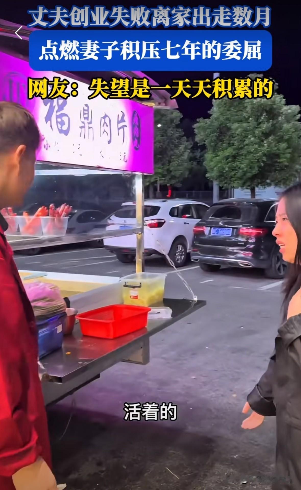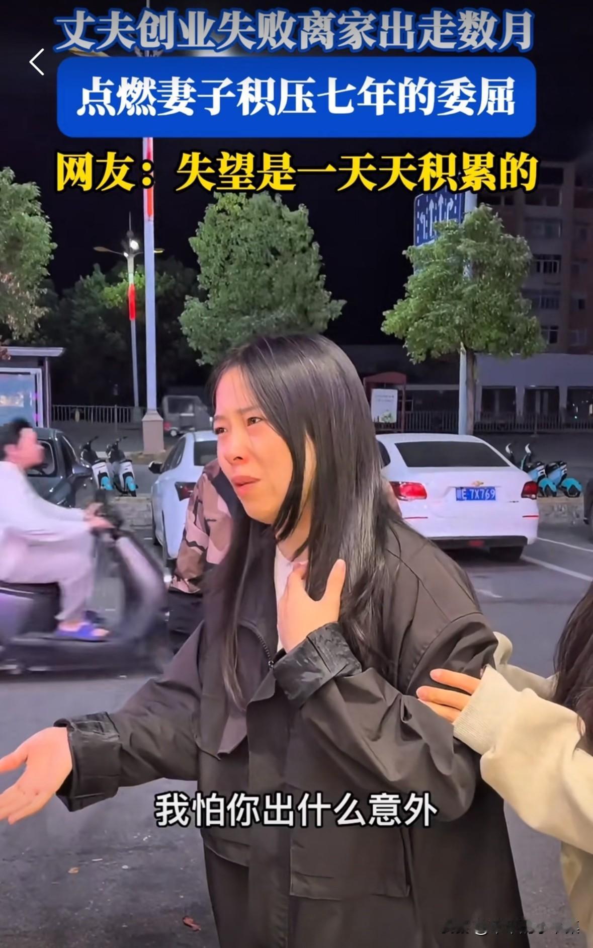丈夫创业失败,直接离家出走好几个月,妻子到处找都找不到,直到有一天逛街遇到了! 这时候的男子在街边摆摊,妻子看到后,这些年心里积攒的委屈全部爆发了,哭着向丈夫诉说! 妻子说:“你消失的这几个月,哪怕你去找别的女人都行,只要让我知道你是平安的,是活着的。” 我想你丈夫只是不想让你看到他最狼狈的一面,让他沉淀一下,一定能东山再起! 但是不管去哪,最好跟妻子说一声,免得让她担心。 你的妻子是个好妻子,你一定要好好对她。创业失败