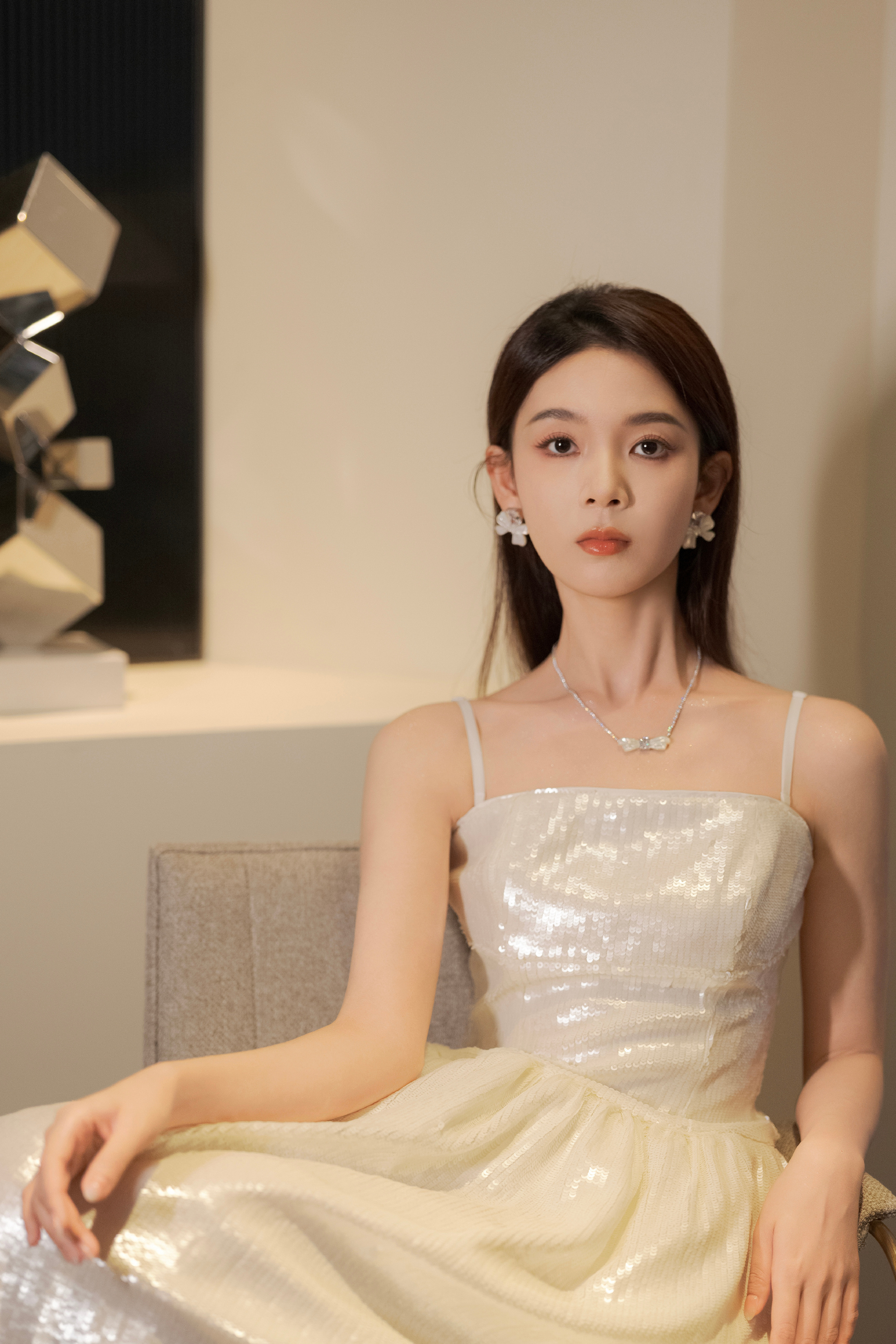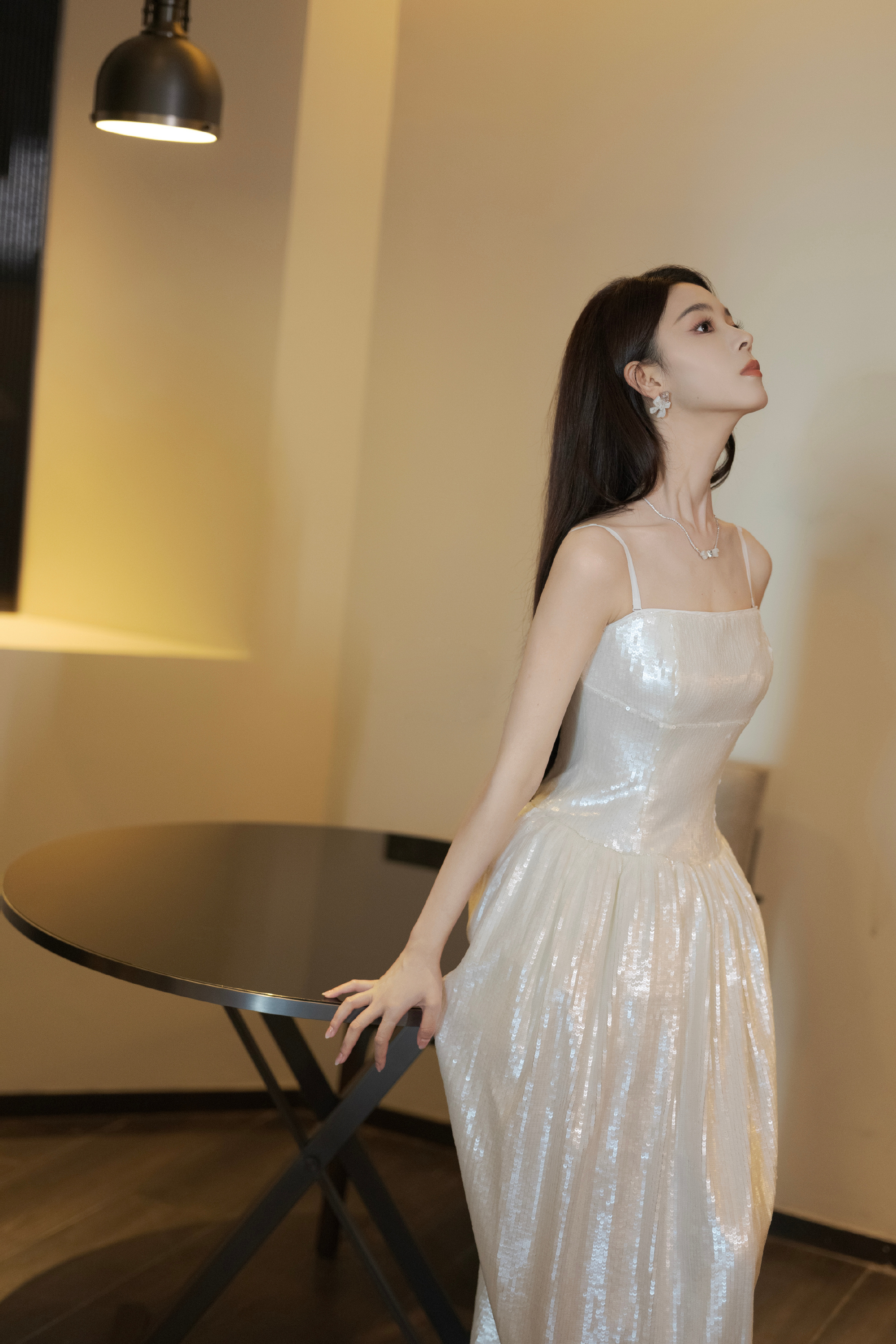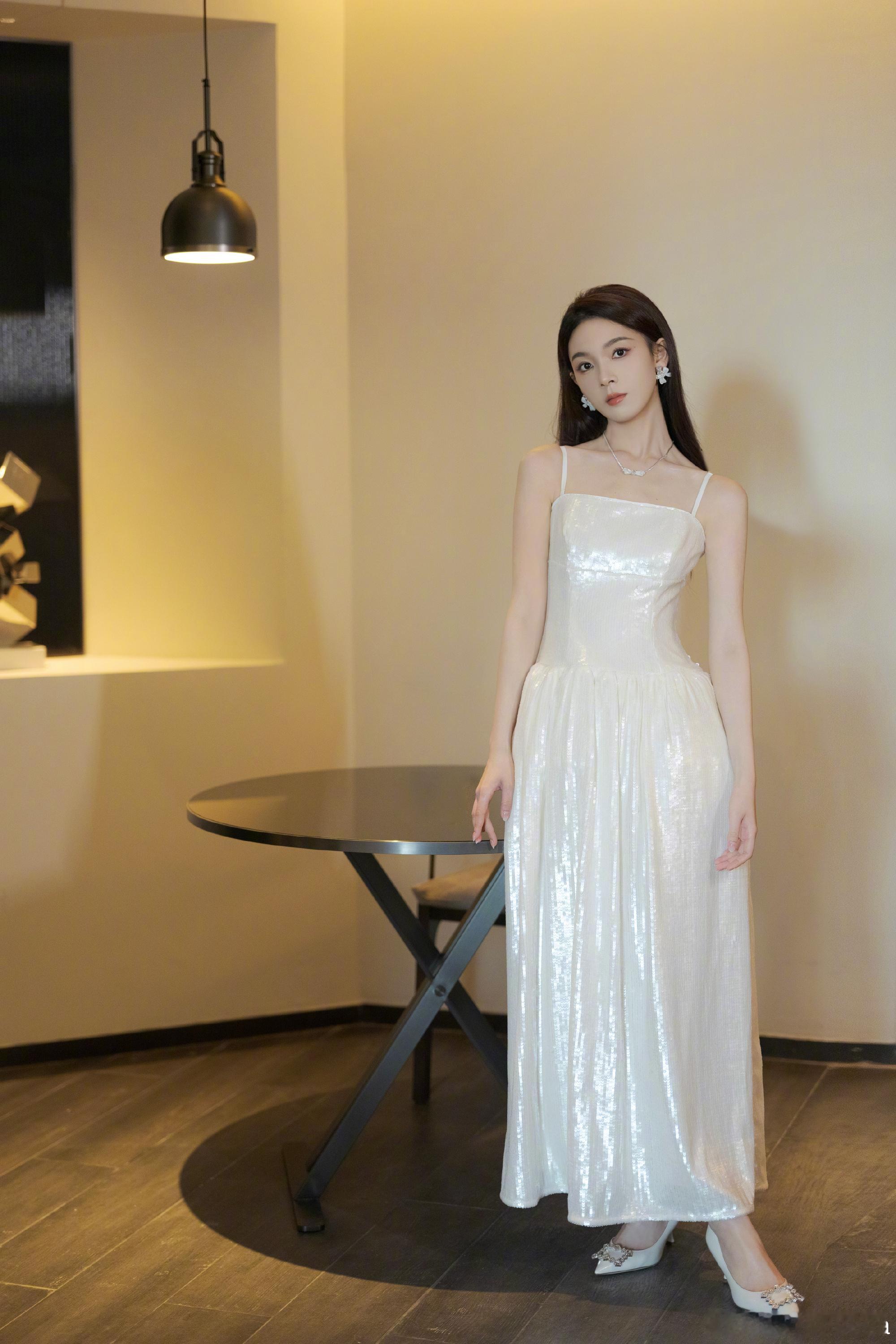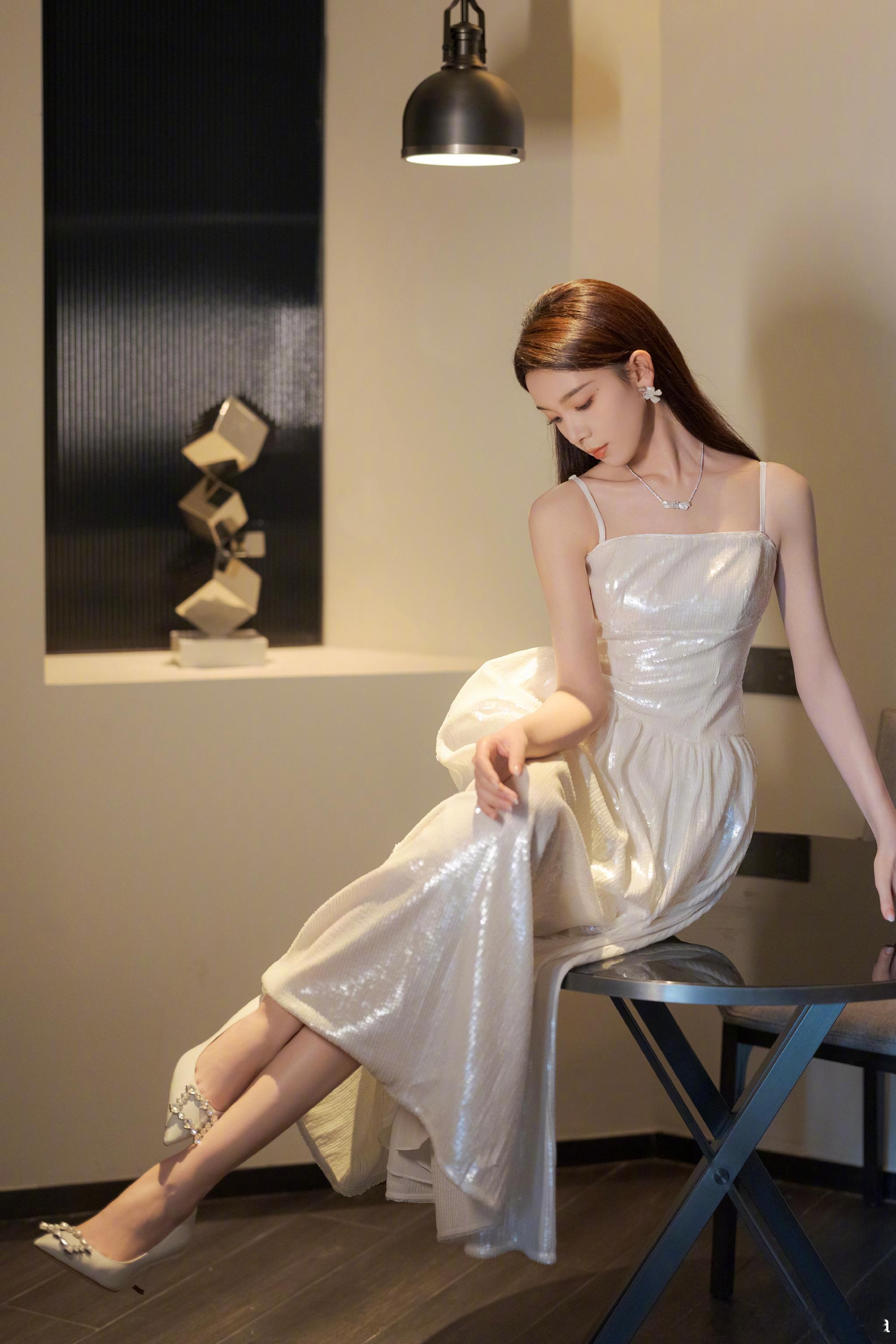 陈瑶,柔和白调吊带长裙,静谧温柔