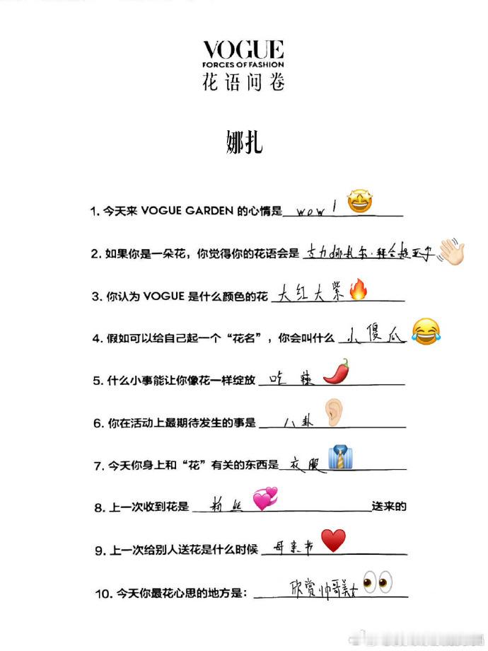 娜扎给自己起的花名是小傻瓜娜扎在VOGUE最期待听八卦娜扎 VOGUE 参与花语互动!花名选 “小傻瓜”,期待听八卦的样子真实又可爱。