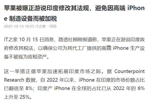印度又要割韭菜了:苹果8条产线从中国搬到印度后,印度拿出1961年法律,说苹果不能只交印度的税,而且全球营业额的总税收… 谁都知道苹果迁产不是脑子一热,纯粹是被关税逼得走投无路。2025 年第二季度光中美贸易摩擦里的关税成本就亏了 11 亿美元,库克咬着牙把 8 条核心产线从中国搬到印度,前前后后折腾了好几年,富士康和塔塔砸进去的真金白银超 50 亿美元。 从 2017 年只能凑活造低端 iPhone SE,到现在五家工厂能批量生产 iPhone 17 全系,连最高端的 Pro 版都能搞定,今年前四个月印度造的 iPhone 出口额直接冲到 75 亿美元,美国市场卖的 iPhone 17 更是全改成了印度造。 为了赶工避关税,苹果甚至游说印度空管把金奈机场的清关时间从 30 小时砍到 6 小时,用飞机拉着 600 吨 iPhone 往美国赶。 本以为能靠印度产线喘口气,结果这边机器刚转顺,印度税务部门就翻出了压箱底的 1961 年《所得税法》,死抠 “业务关联” 四个字不放。 说白了就是认定苹果印度公司和总部、海外供应商之间存在利益勾连,不能只按印度本地营收缴税,得把全球营业额里 “相关的部分” 都算进来缴税。 这操作有多狠?相当于你在小区开个小卖部,物业突然翻出几十年前的老规定,说你得按全家收入交物业费。 这可不是印度第一次干这种事,就在苹果被盯上之前,三星刚被印度税务部门追着要 6.01 亿美元的税款和罚款,理由是 “进口零部件分类不当”,这几乎掏走了三星在印度一年大半的利润。 大众汽车更惨,被要求补缴 14 亿美元关税,就算喊着 “没有不当行为”,也得耗在印度法院里打官司。韩国网友都看得明白:“这就是逼企业空手离开印度”。显然,苹果不过是下一个被收割的目标,1961 年的老法律早成了印度的 “提款机说明书”。 更坑的是,印度还给苹果画过 PLI(生产关联激励)计划的大饼,号称给补贴吸引企业建产能。可实际情况是,这计划实施这么久,补贴发放比例还不到 8%,制造业占印度 GDP 的比重反而从 15.4% 降到了 14.3%。 苹果为了拿补贴,答应 2025 年底把本地采购率提至 50%,还催着塔塔建两座制造中心、富士康加码 15 亿美元建元器件工厂。可现在税单先来了,要是后续采购率不达标,印度指不定还会拿补贴卡脖子,简直是 “先喂糖再抄家”。 苹果这会儿是进退两难,想撤吧,50 多亿投资砸下去了,塔塔刚计划花 50 亿建 “从芯片封装到整机组装” 的全链条,富士康的产能还在往 7000 万部 / 年冲,这些沉没成本根本收不回来。 硬扛吧,不光要交全球税,印度产线的隐忧也快藏不住了。现在印度工厂还只能稳定生产旧机型,要是明年赶工 iPhone 18,良率问题可能导致首销断货,为了补效率缺口给代工厂的加工费,早把人力成本优势抵消了。 更要命的是,iPhone 零部件大多还得从中国运,就算组装在印度,关税风险压根没彻底解决,反而多了层税务枷锁。 说到底,印度这波操作就是看准了苹果 “骑虎难下”。知道你为了避关税不得不来,也知道你投了钱就没法轻易走,才敢翻出几十年前的老法律下手。之前喊着 “打造全球制造中心”,吸引来企业后就露出了收割本性,三星、大众的遭遇早把套路演透了。 苹果这亏吃得实在憋屈,可也给其他想往印度迁产的企业提了个醒:印度的 “低成本” 背后,藏着随时能掏出来的税务刀子。以前总觉得中美贸易摩擦下印度是避风港,现在看来,这港里可能全是暗礁。 毕竟在印度面前,什么 “供应链多元化”“制造转移”,到头来都可能变成被收割的理由,1961 年的老法律,就是最好的证明。