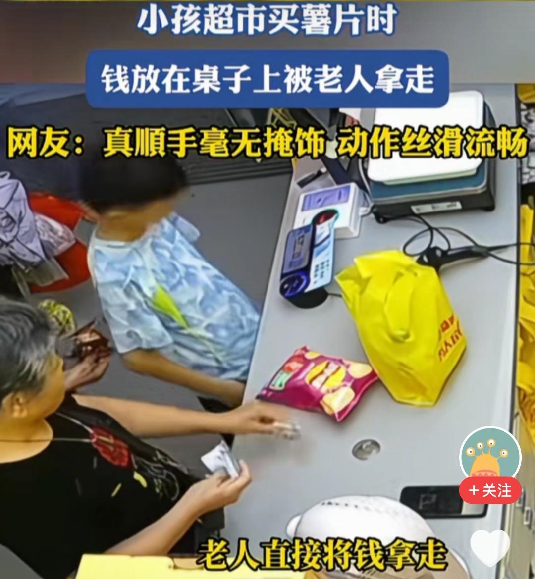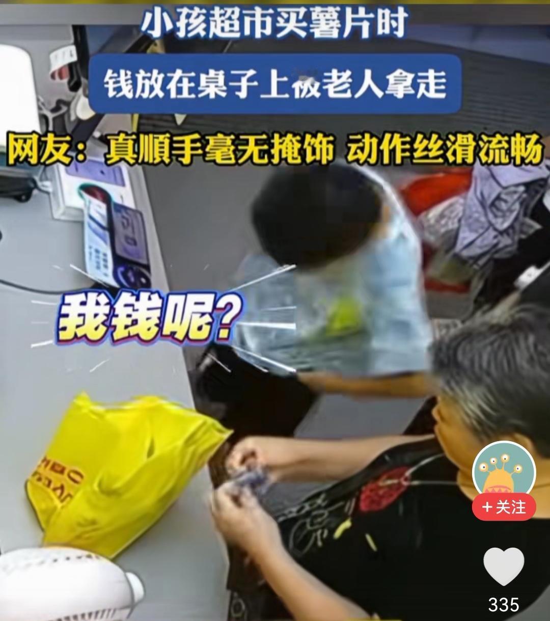 小孩哥还没入社会,就见识到了人心险恶。他怎么也想不到,身后慈祥的老奶奶会“偷”走他的钱。他一定在心里想:“肯定不是人类拿了我的钱,或者某个人类家里有人快死了,等着钱救命吧。”这个“偷”钱的老奶奶估计也有心理活动,她可能会给自己的行为找个正当理由,比如“小孩子吃零食对牙不好,我帮帮他吧,反正我没牙。我得赶紧走,他要是哭起来,天天向佛祖祈福让我儿孙健康就该不灵啦。”