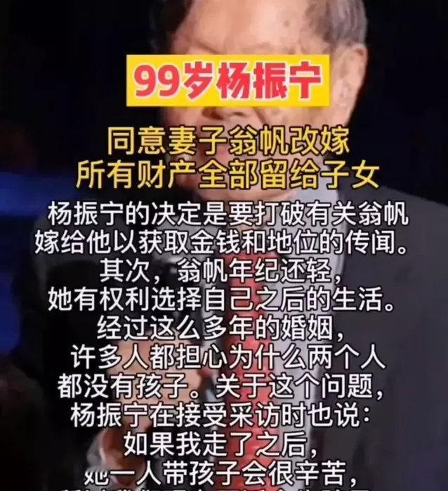 杨振宁逝世:当我们谈论翁帆的"图谋",我们在亵渎什么? 103岁的杨振宁与世长辞了。这位与牛顿、爱因斯坦同列的物理巨擘,留给世界的本应是"杨-米尔斯规范场论"这样影响半个世纪物理发展的遗产,可社交平台上最扎眼的讨论,却是"翁帆终于熬出头了""她到底图什么"。 这种带着恶意的揣测,像附骨之疽跟着这段婚姻走了二十年。从2004年82岁的杨振宁与28岁的翁帆领证开始,"一树梨花压海棠"的戏谑就没断过。有人翻遍照片找翁帆"憔悴嫌弃"的证据,有人编造"遗产争夺战"的戏码,更有人笃定这是"各取所需"的交易——老人要照顾,女人图名利。可当杨振宁早在多年前就立下遗嘱:"我走后你可以再婚",翁帆那句带着哭腔的"我当然不会",似乎从没真正走进这些人的耳朵。 要回答"翁帆图什么",得先看懂这段婚姻的起点从不是2004年。1995年汕头大学的华人物理学大会上,大一的翁帆作为接待员认识了杨振宁夫妇,此后多年的书信往来里,没有暧昧,只有对学术的请教与对生活的问候。那时的杨振宁有相伴半世纪的妻子杜致礼,翁帆也有自己的家庭,命运的交集清淡如水。 2003年的变故成了转折点。杜致礼逝世,翁帆刚结束失败的婚姻,两个经历感情失落的人在书信中找到了共鸣。当82岁的杨振宁提出求婚时,这场跨越54岁的爱恋,底色从来不是冲动。杨振宁的子女坦然祝福,翁帆面对"崇拜还是爱"的追问时说得透彻:"当你崇拜的人也爱你,很容易就爱上他了,我只是选了条人迹稀少的路"。 外人最在意的"名利",恰恰是这段婚姻最不缺的证明。2006年的婚前财产公证写得明白:杨振宁仅留一栋房子作为婚后财产,其余全部归子女。没有巨额遗产的承诺,没有名利的捆绑,翁帆陪着他走过的二十年,是清晨准备早餐的琐碎,是傍晚并肩散步的安宁,是他躲进卫生间看书怕吵到她的温柔,是她弹钢琴时他静静聆听的专注。这种细碎的陪伴,远比任何物质承诺更有分量。 更该被看见的,是这段婚姻里的共同成长。在翁帆的照料下,八九十岁的杨振宁依然活跃在科研一线,推动中国冷原子物理向前跃进几十年;翁帆也在2011年考入清华读博,从青涩接待员成长为能与丈夫探讨学术的同行者。他们不是彼此的负担,而是照亮对方的光——杨振宁说"透过翁帆的生命,我与三四十年后的世界有了关联",翁帆则坦言"他为我营造了最纯净的世界"。 那些嘲讽者或许从没想过,当杨振宁放弃美国高薪、卖掉房子捐给清华,当他募集千万美元建起"大师邸"召回顶尖人才,当他义务搭建60多个物理实验室时,翁帆始终站在他身边。他们争论超级对撞机时,有人骂他"回国圈钱养老",却选择性忽略他为中国物理学培养上千名人才的事实;他们八卦翁帆"加速老化"时,却看不见她在清华图书馆里钻研的身影。 张五常说"中国科学天才只有杨振宁",《自然》杂志将他列为千年最伟大物理学家第18位,与爱因斯坦、牛顿同榜。可在一些人眼里,这位改变人类对宇宙认知的巨擘,到头来只配被谈论情史。当国外学界追捧他30多篇SCI论文时,我们却在纠结他的婚姻"伤不伤风气",这何尝不是一种认知的悲哀。 杨振宁逝世后,翁帆遵照遗嘱处理后事,没有哭诉,没有辩解。或许她从未想过要向谁证明什么,正如二十年来面对质疑时的沉默——最好的回答从来不是语言,而是二十年不离不弃的陪伴,是共同为中国物理学付出的努力,是那份"文章千古事,得失寸心知"的坦然。 所以问"翁帆图什么"的人,终究是用自己的狭隘丈量了别人的深情。她图的,或许是与伟大灵魂对话的通透,是精神契合的安宁,是陪一个人从耄耋到百岁的坚守。而这些,恰恰是那些被名利蒙蔽双眼的人永远无法理解的。 杨振宁先生走了,留下了改变世界的科学遗产,也留下了一段关于爱的范本。当我们缅怀这位科学巨星时,最该收起的,是那些廉价的揣测与恶意的八卦——尊重他的婚姻,才是对他最基本的致敬。