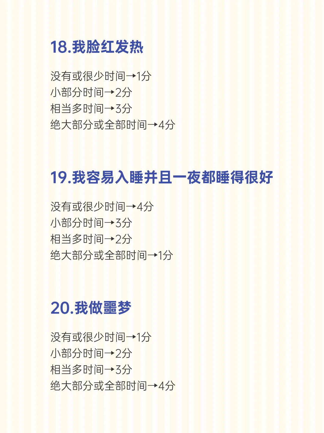 测试结果: 计分方式 : 将20道题得到的总分乘以1.25。 即为你的焦虑量表自评所得的标准分。 测试结果低于50分为正常; 50-59分为轻度焦虑; 60-69分为中度焦虑; 70分以上为重度焦虑。