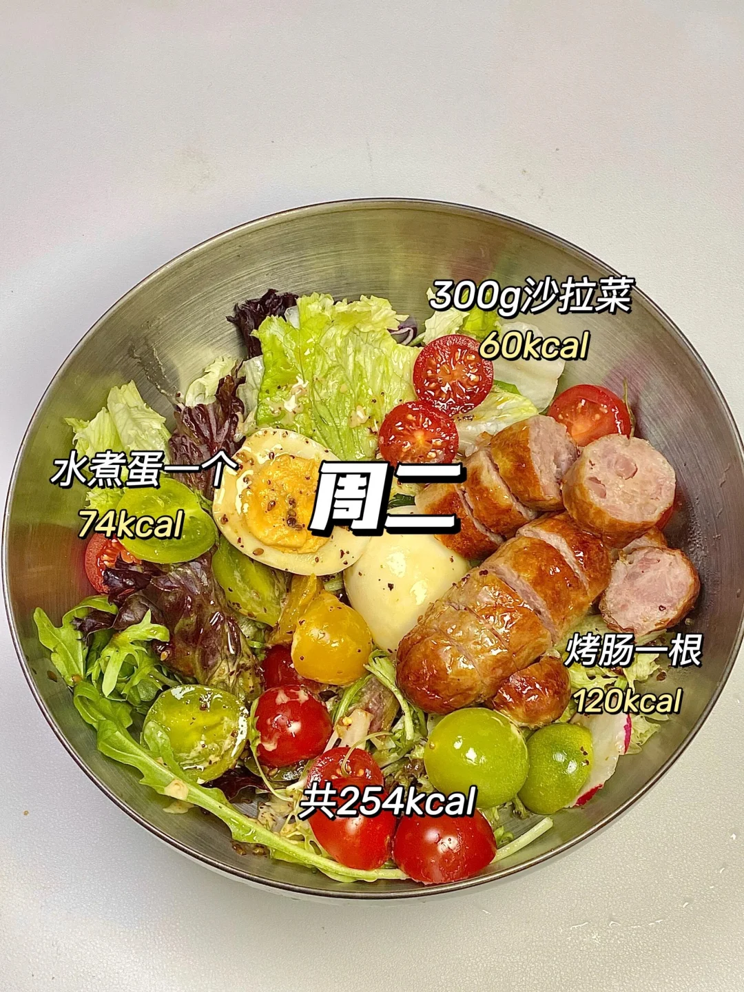上周的沙拉晚餐记录📝 1️⃣蟹柳蔬菜沙拉 251kcal 2️⃣烤肠鸡蛋沙拉 254kcal 3️⃣牛肉蔬菜沙拉 265kcal 4️⃣水煎鸡胸肉沙拉 267kcal 5️⃣午餐肉蔬菜沙拉 253kcal 6️⃣大虾蔬菜沙拉 182kcal 沙拉真的适合懒人减脂!备好菜就不用再想晚上下班吃什么,直接冰箱里拿一包吃就行,按照沙拉公式来,第二天掉秤基本就不会出错! 蔬菜➕蛋白质➕水果➕碳水 ➕沙拉汁,直接淋在沙拉上,拌一拌鸡方便!关键还是0糖0脂0添加,多个口味换着吃!很适合减脂的姐妹们!