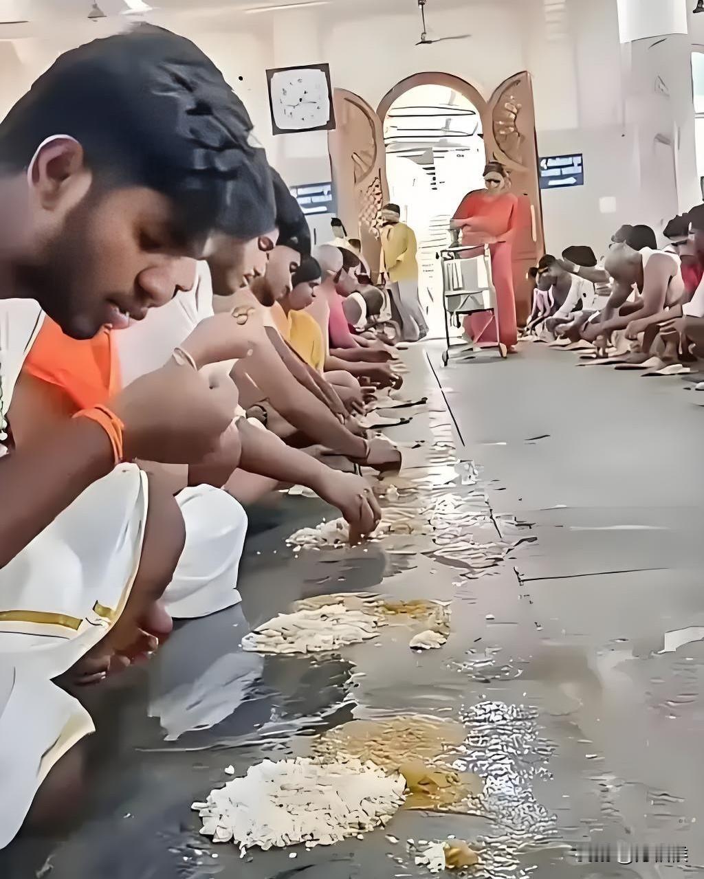 在婚礼大厅里,大家都遵守古训。由于天然的气温在45°-50°左右,所以穿的轻薄,简约。把奢华扔在大厅外,把繁文缛节抛在脑后,让肚子尽快达到满意状态很重要。为此,必须干干净净的进入大厅,把鞋子放在厅外,光脚进入才是对隆重的婚礼现场表达尊重。 经常有用芭蕉叶,报纸,塑料盒当餐具,那都是拍视频用的摆拍。而真正的食实务主义者不需要装假,因为我们有三七二十五味咖喱调味品,能掩盖一切外来气味。在大厅的地上,就算有来来往往的送餐者再送来七七一十五种咖喱菜,但我们已经打开的味蕾,正在享受饕餮盛宴的兴奋无法改变。 但我们的右手一天到晚装填永不满足胃口,左手实在闲的没事干。我们的左手右手永远不会相互洗手互搓,因为右手干的是干净的事,左手通常是不干干净的活,因此,苹果🍎手机才会有超标一说。 不干不净吃了没病,这不是每一个现代人的肠胃都能接受得了