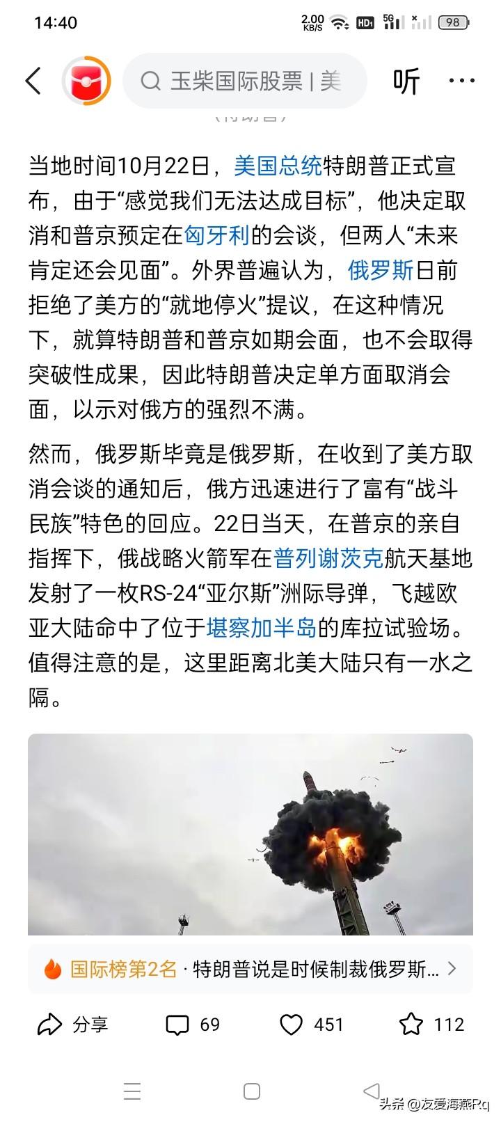 被吓住?还是被激怒? 10月22日,美国总统特朗普似乎断然取消了原定在匈牙利与俄罗斯总统普京会见的计划,并且美国财政部长贝森特当天同时宣布,对俄罗斯的两家最大石油公司,俄罗斯石油公司和卢克石油公司进行严厉制裁。与此更巧的是,据传闻说,也是在10月22日,欧盟成员国通过了对俄罗斯的第19轮制裁方案。 俄罗斯总统普京好像也毫不客气,大概也是用他们惯有的方式予以回击,发射了一枚RS-24“亚尔斯”洲际导弹。RS-24“亚尔斯”是一种可装载多枚核弹头和诱饵弹头的重型洲际导弹,射程超过一万公里,是俄罗斯导弹部队中差不多威力最强大的武器。并且,由于“亚尔斯”洲际导弹是多弹头,同时还装有诱饵弹头,无疑大大增加了拦截击落的难度,甚至是无法彻底全部拦截。 从大头领的一贯表现看,他并不愿意与大毛之间发生直接冲突,并且还或许还真的是有那么一点怕大毛的大杀器的意思。当然,这与究竟是谁的武器威力更强大无关,因为没有经过真正的实战,无论任何人也下不了结论。 不过,由于大首领经常忽东忽西,忽上忽下,人们也很难搞清楚和闹明白大首领的真实心理状态。