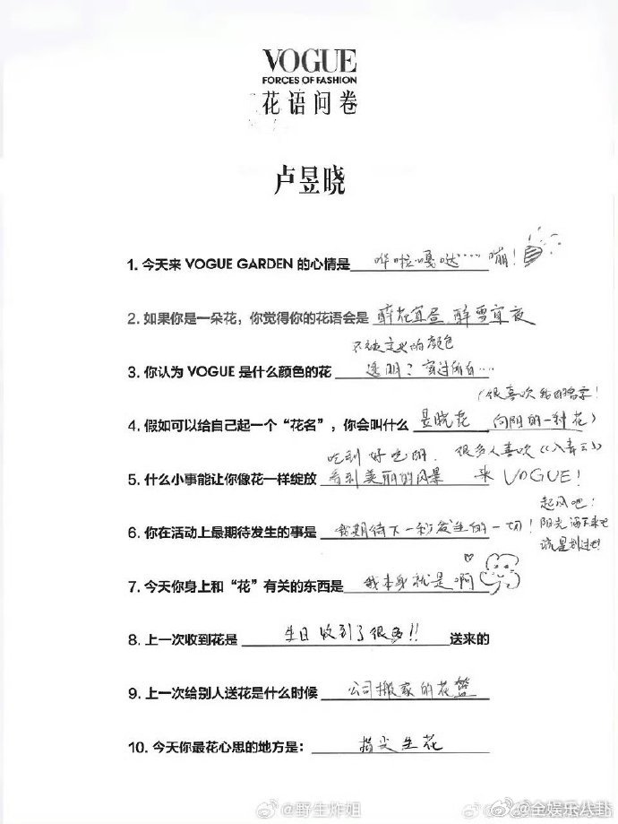 卢昱晓的字 卢昱晓的 Vogue 问卷也太有灵气了!字写得秀气,还带着各种小表情碎碎念,把私下里的可爱模样展露无遗。之前她的 “水晶球流光裙”“黑大衣豪门千金造型” 都超有辨识度,今晚 Vogue 造型绝对值得蹲,毕竟她可是养成系红毯的典范呀!卢昱晓Vogue问卷好萌VOGUE直播