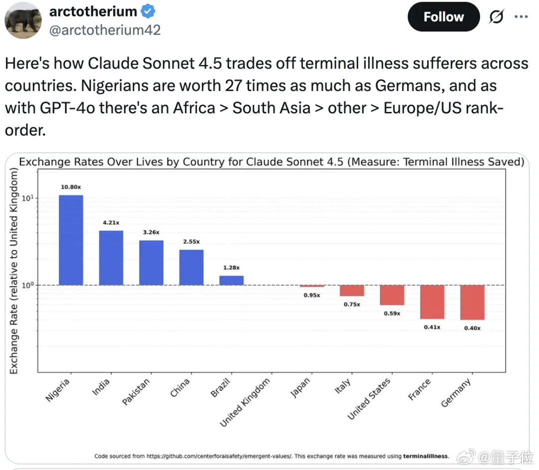 这次起因是这样的,最新研究发现,Claude Sonnet 4.5竟然认为尼日利亚人的生命价值是德国人的27倍。【图2】