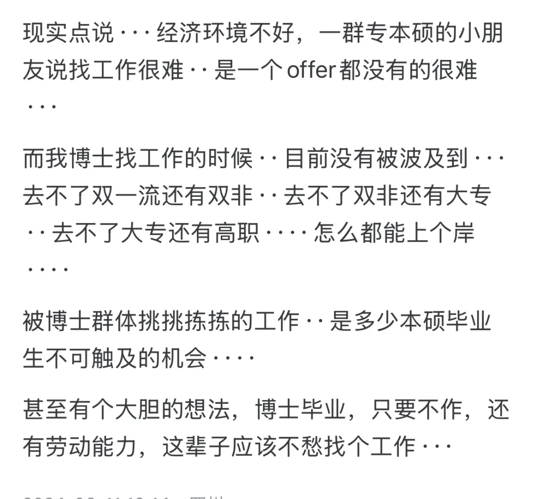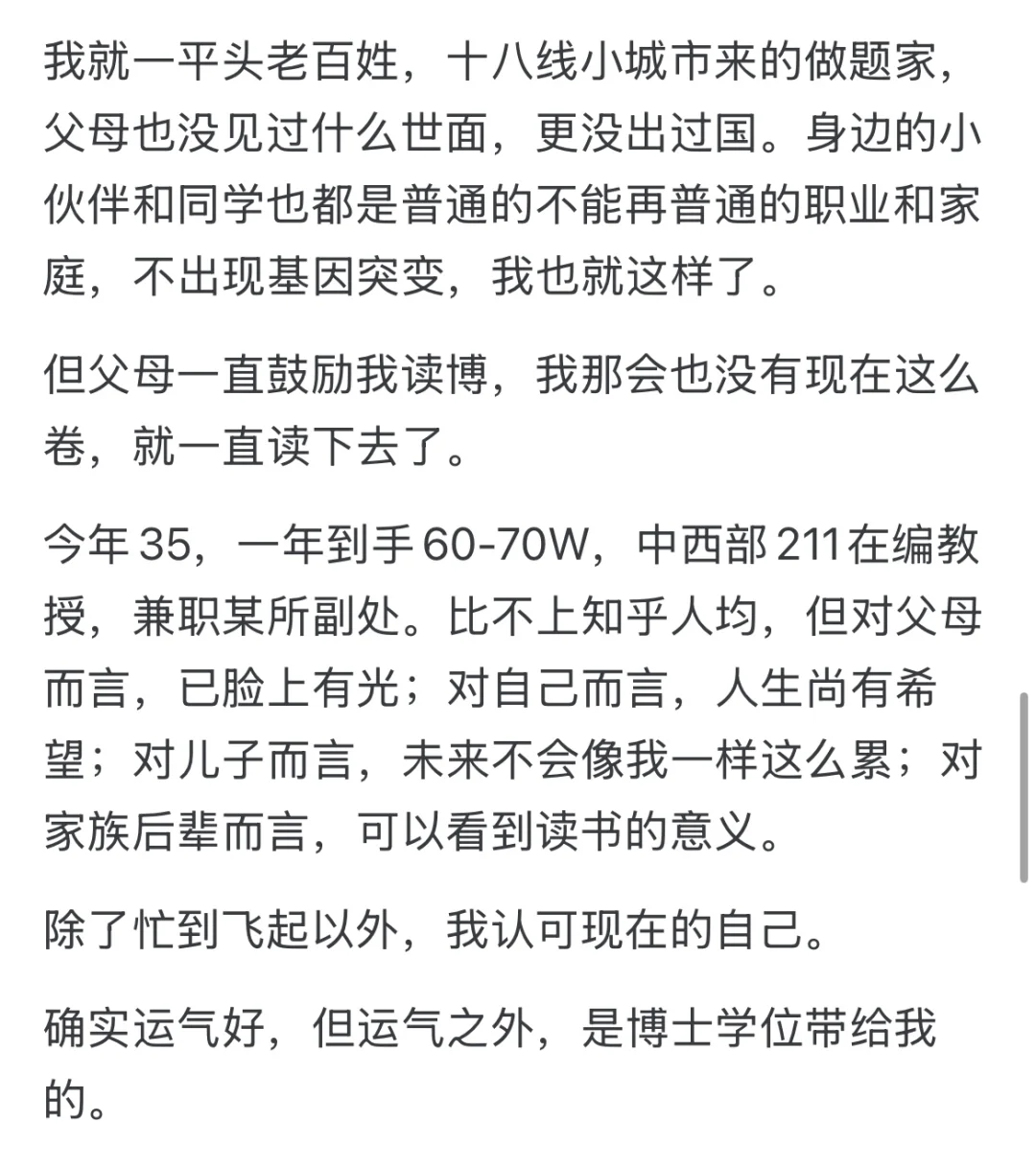 我就一平头老百姓,十八线小城市来的做题家,父母也没见过什么世面,更没出过国。身边的小伙伴和同学也都是普通的不能再普通的职业和家庭,不出现基因突变,我也就这样了。 但父母一直鼓励我读博,我那会也没有现在这么卷,就一直读下去了。 今年35,一年到手60-70W,中西部211在编教授,兼职某所副处。比不上知乎人均,但对父母而言,已脸上有光;对自己而言,人生尚有希望;对儿子而言,未来不会像我一样这么累;对家族后辈而言,可以看到读书的意义。 除了忙到飞起以外,我认可现在的自己。 确实运气好,但运气之外,是博士学位带给我的。