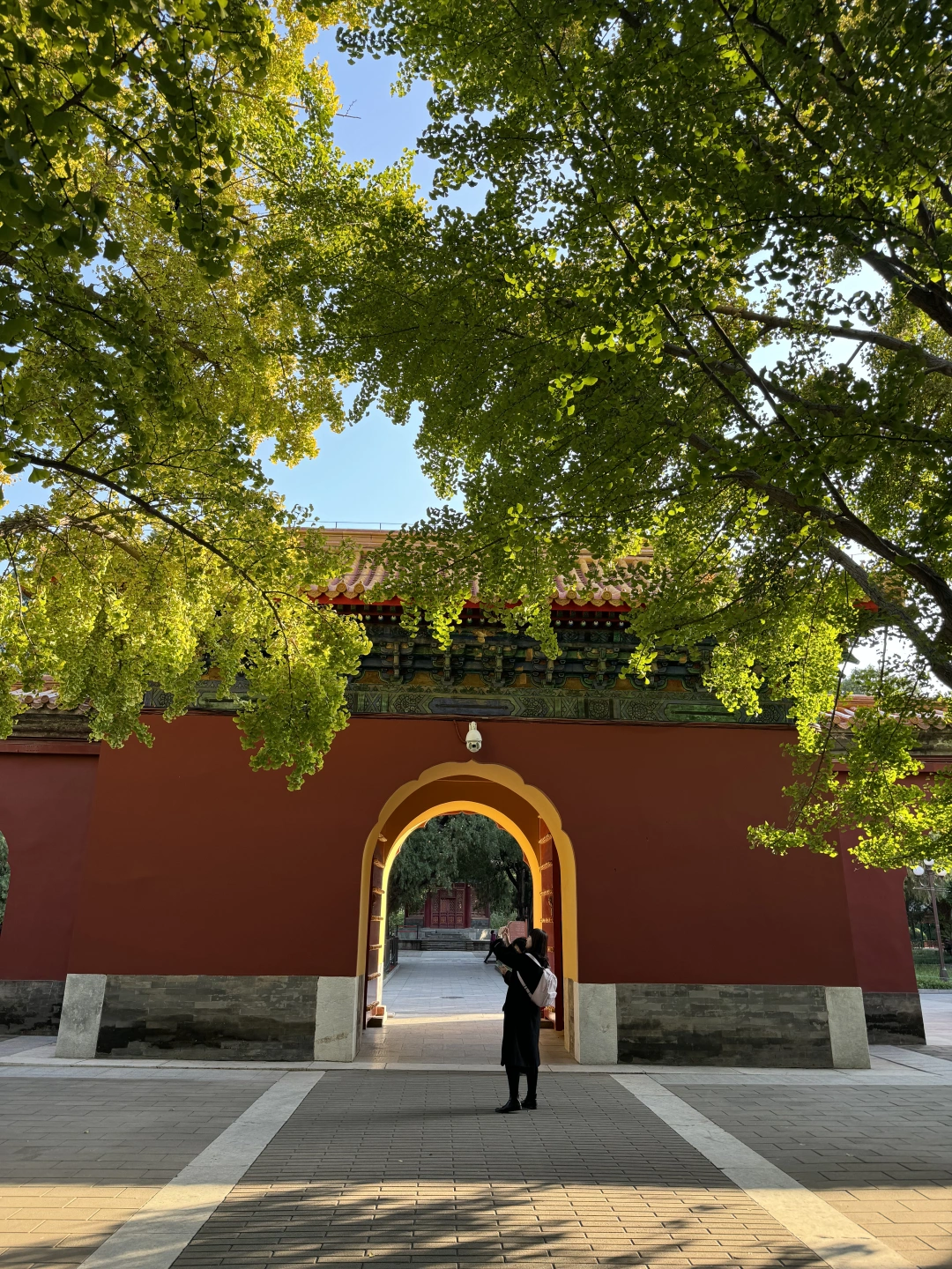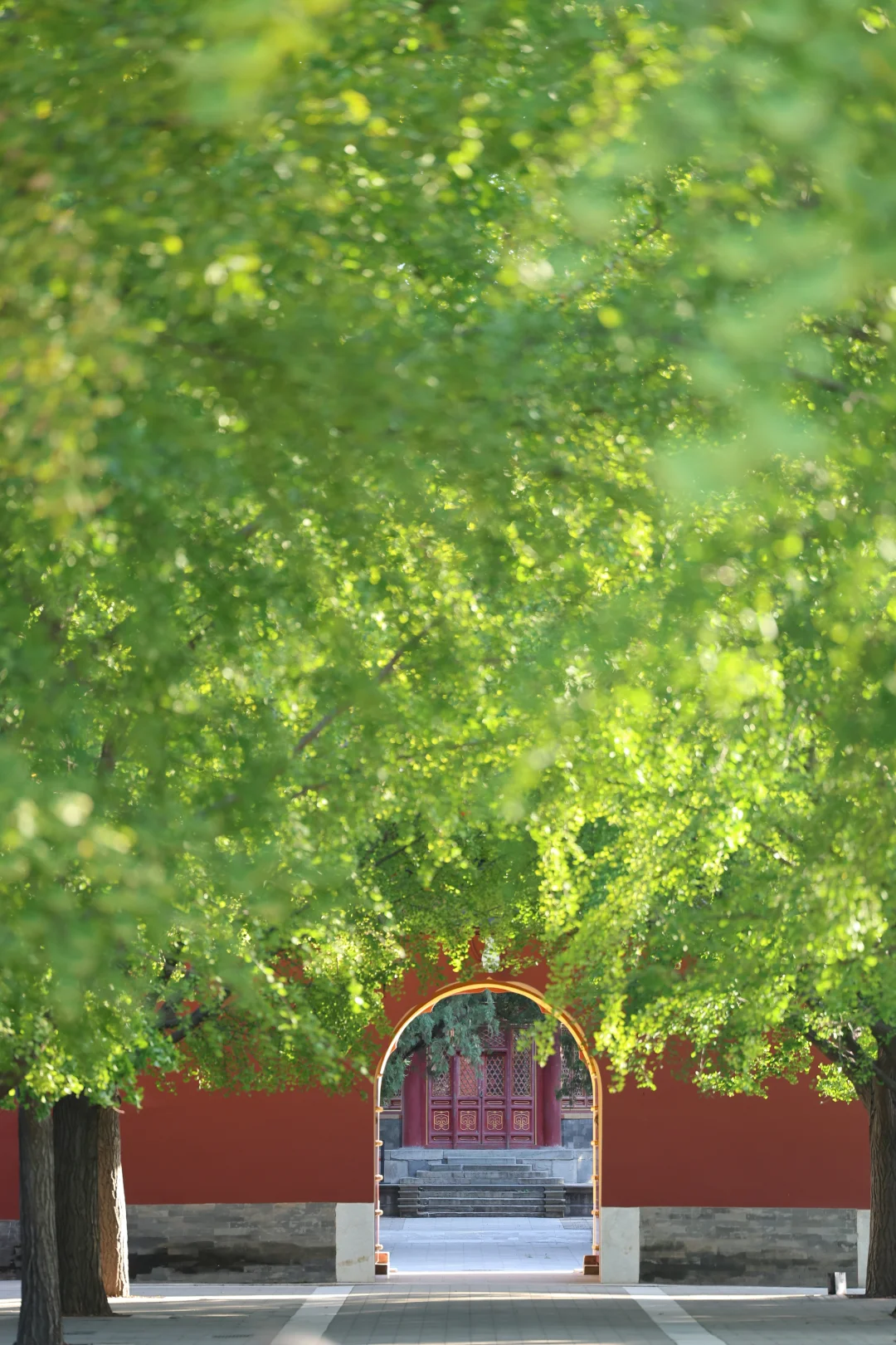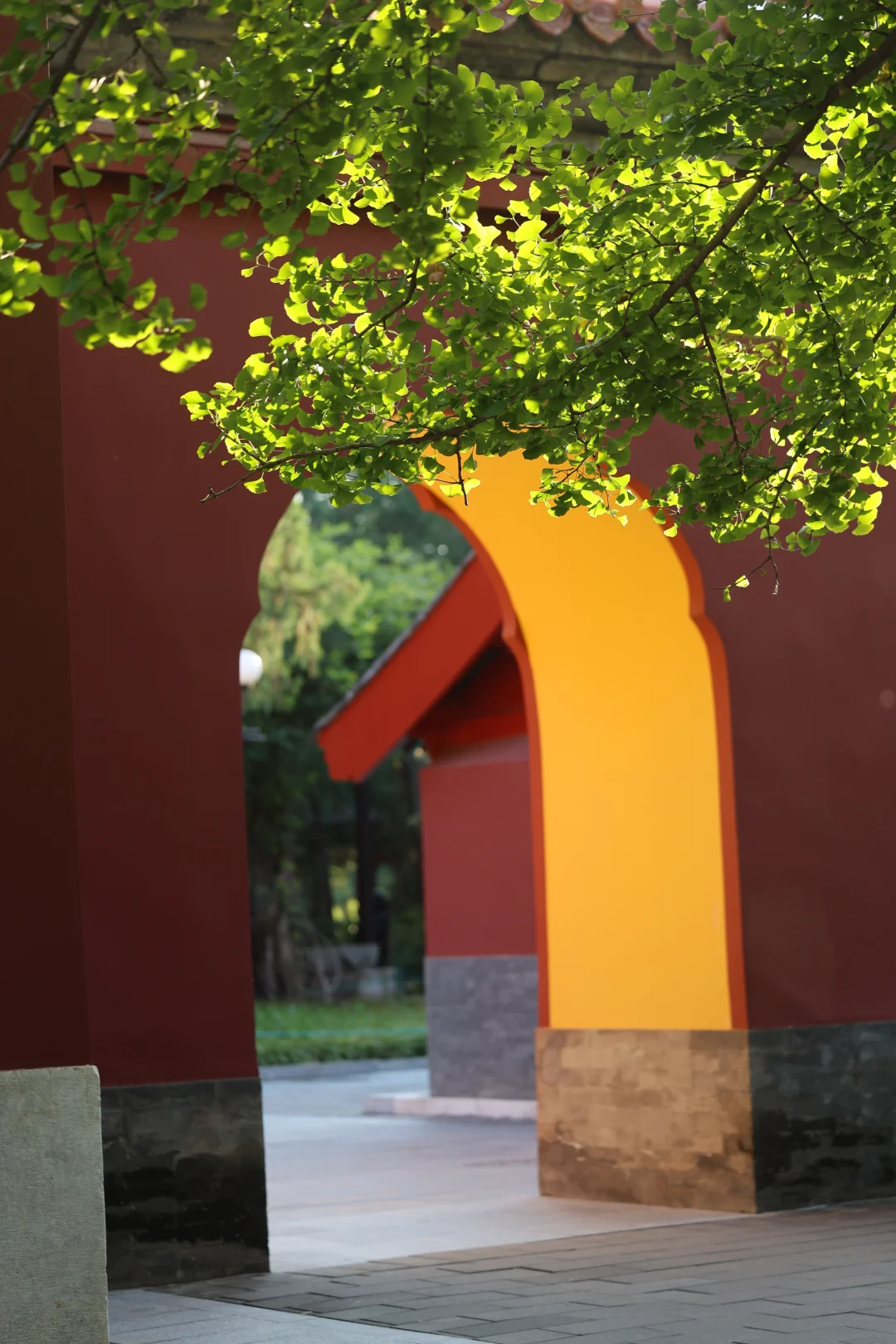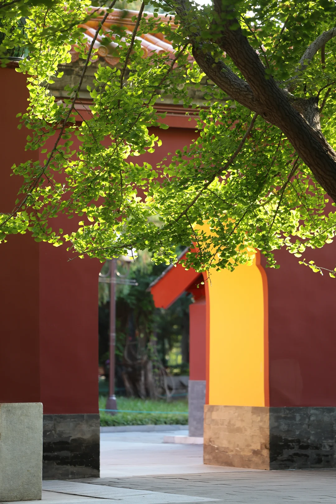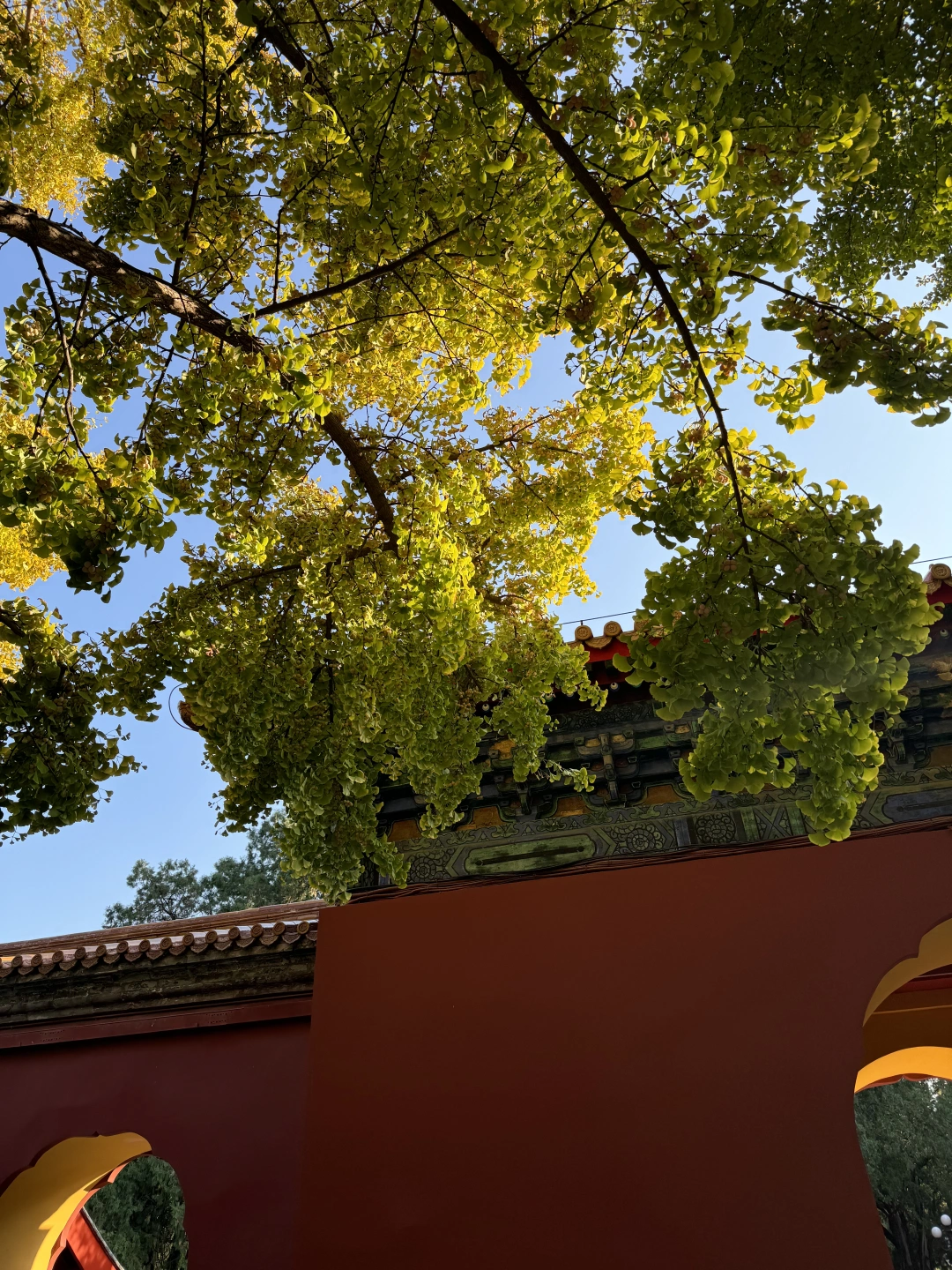在阳光下,银杏配红墙/门,还可以