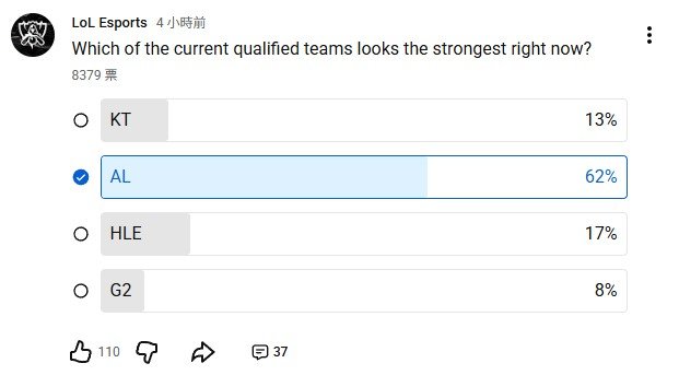 随着昨日HLE、G2成功取胜,目前已有四支战队成功晋级八强,分别是KT、AL、HLE、G2,LOL赛事官方也发出投票,有62%的人认为AL是目前四支八强战队中最强的!