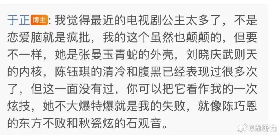 更夸张的是,他还说“新角色有张曼玉青蛇的外壳,刘晓庆武则天的内核”