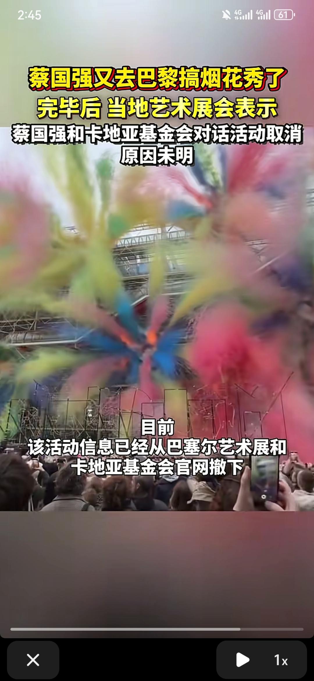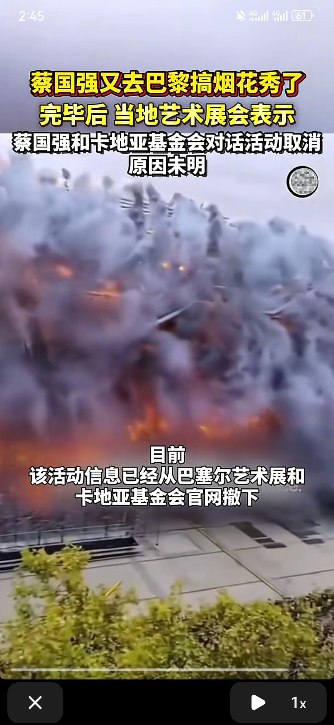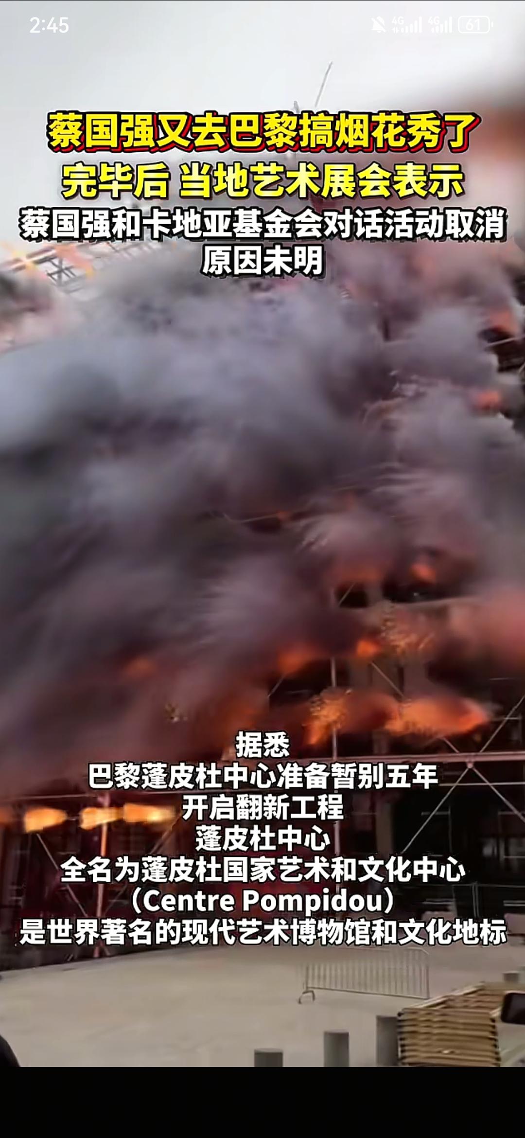 蔡国强又跑去巴黎搞烟花秀了,现场还是围满了许多外国人,可能是他们感觉到好奇 自从上次他在喜马拉雅搞的“升龙”烟花秀,造成了巨大的环境污染,以后在国内估计是没有人买他的账了 如今又转去国外,除了放烟花这件事,他就不能搞其他的了吗? 大家怎么看?