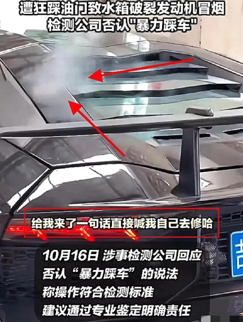 “排气管喷火了还在踩!”700万兰博基尼车主遭检测人员暴力审车 10月15日,四川成都。男子称自己的兰博基尼年审时,遭到检测人员狂踩油门,只短短半小时,就被折腾得排气管喷火、发动机舱冒黑烟。防冻液漏了一地,水温已经爆表,直奔130°C。 谁能想到,一场常规的年检,竟把好好儿的一辆超跑折腾成了待修的“病号”。男子气得手都在发颤,愤怒地说:“那火喷得有半米高!设备都报警了还踩,这不是审车,这是毁车!”然而,检测站却说没 “暴力踩油门”,可视频里的喷火画面却又骗不了人。 年审为啥要踩到你一辈子也踩不到的转速呢?其实,年检可以有,但责任得背起来啊,审完车,然后说车没问题了,他们没有责任,好好的车,审完车有问题了,他们也没责任,你车不行,就不知道意义在哪里了?