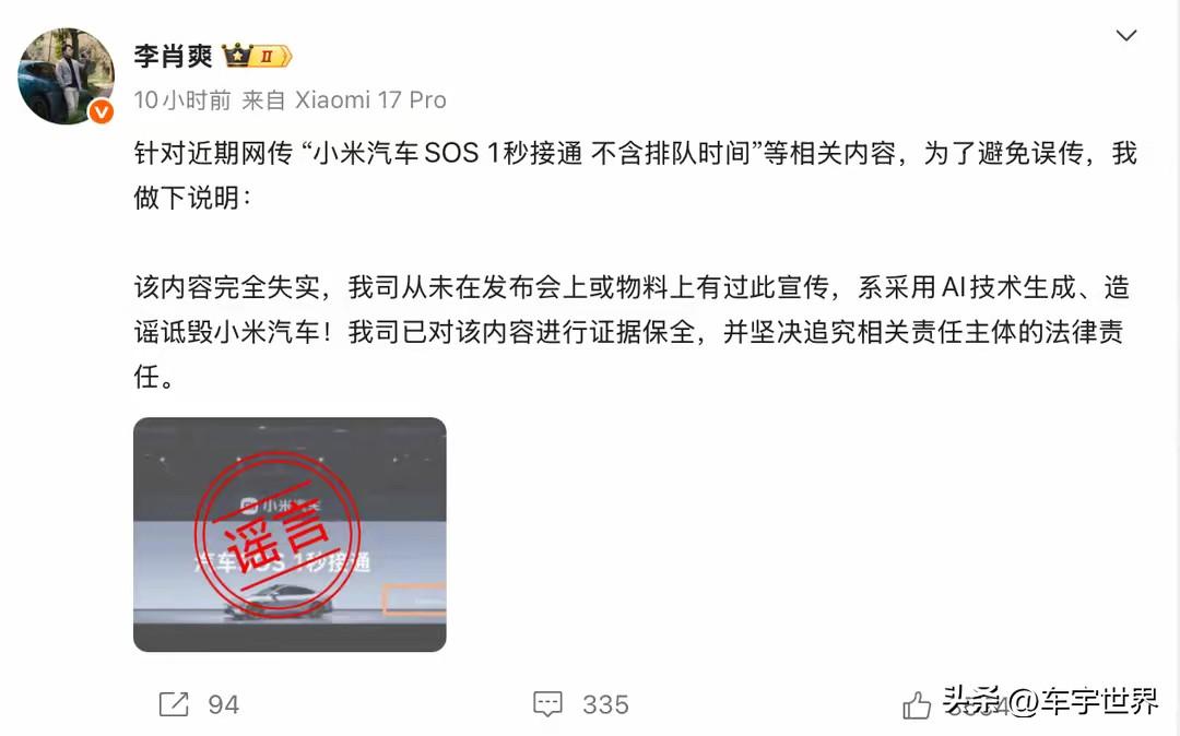 【小米高管辟谣“SOS 1秒接通”】10月22日晚,小米汽车副总裁李肖爽的一则辟谣微博引发热议,直指网传“小米汽车SOS 1秒接通 不含排队时间”为AI生成的虚假内容,强调公司从未有过相关宣传,并已证据保全、将追责到底,公关负责人王化也转发“望周知”表态立场。 这则被指“造谣诋毁”的内容,是一张暗藏玄机的PPT图片——大字标榜“1秒接通”,小字却标注“不含排队时间”,这种矛盾表述极易误导公众。而从行业实情看,车载SOS响应受信号、坐席等多重影响,主流车企平均接通时间在5-8秒,“1秒接通”本就不符合现实规律。 更值得深思的是,此次风波暴露了AI时代的新隐患:虚假宣传素材可被轻易生成并扩散,既伤害企业声誉,也误导消费者对安全功能的认知。 小米的强硬追责,既是维护自身权益,也是对行业乱象的警示。当AI造谣成本降低,如何界定责任、防范传播?消费者又该如何辨别信息真伪?这场“1秒接通”的闹剧,远比事件本身更值得各界警醒。