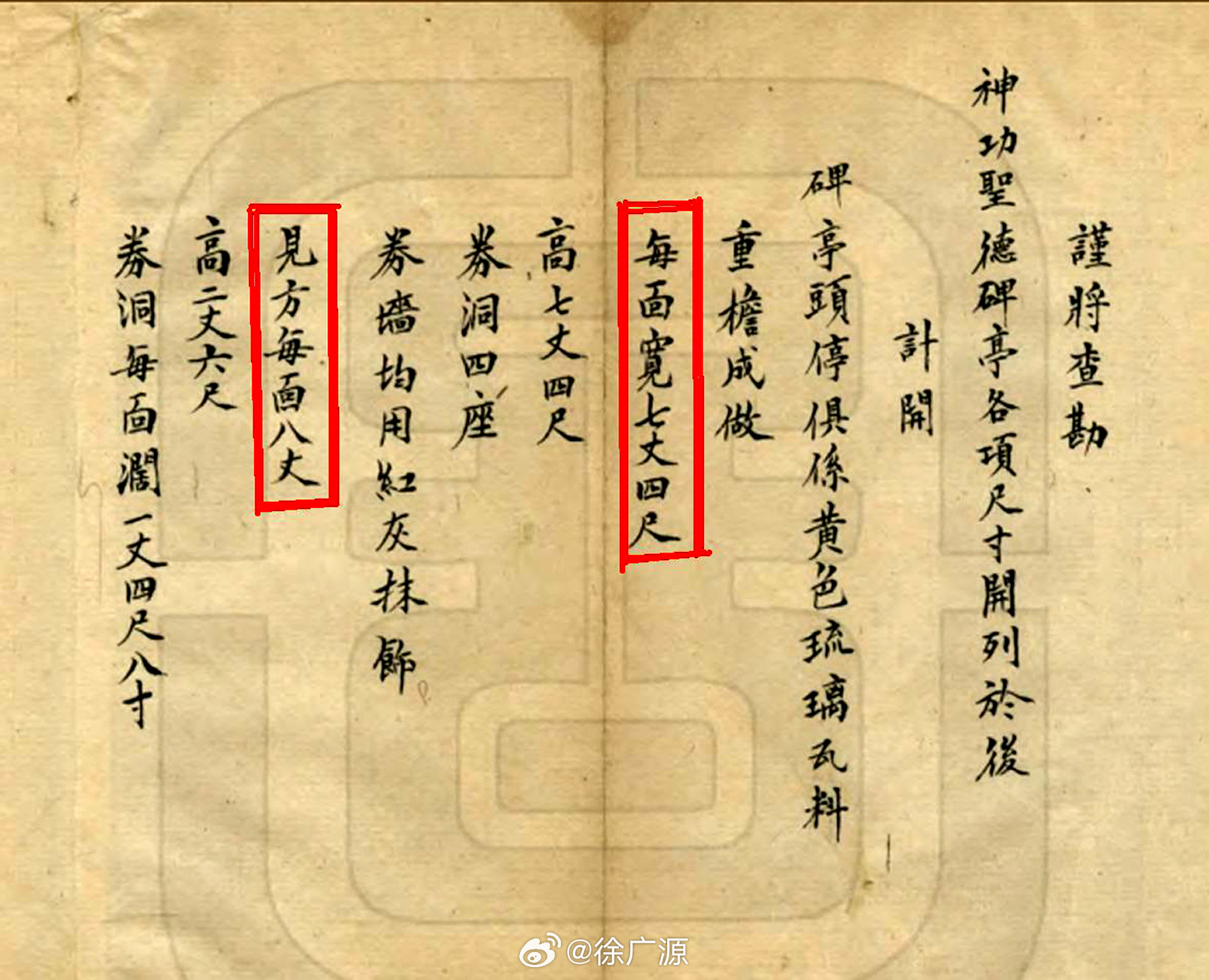 在孝陵大碑楼有关尺寸的清单中我对这两句话:“重檐成做,每面宽七丈四尺”;“见方每面八丈”产生了疑问。根据我对古建筑的了解,认为碑亭的面宽尺寸与见方每面尺寸应该是一样的,是一回事。为什么尺寸不一样呢?又为什么重复说两次呢?肯定当时大臣写的尺寸清单不会写错,只能是我自己认识有问题。
