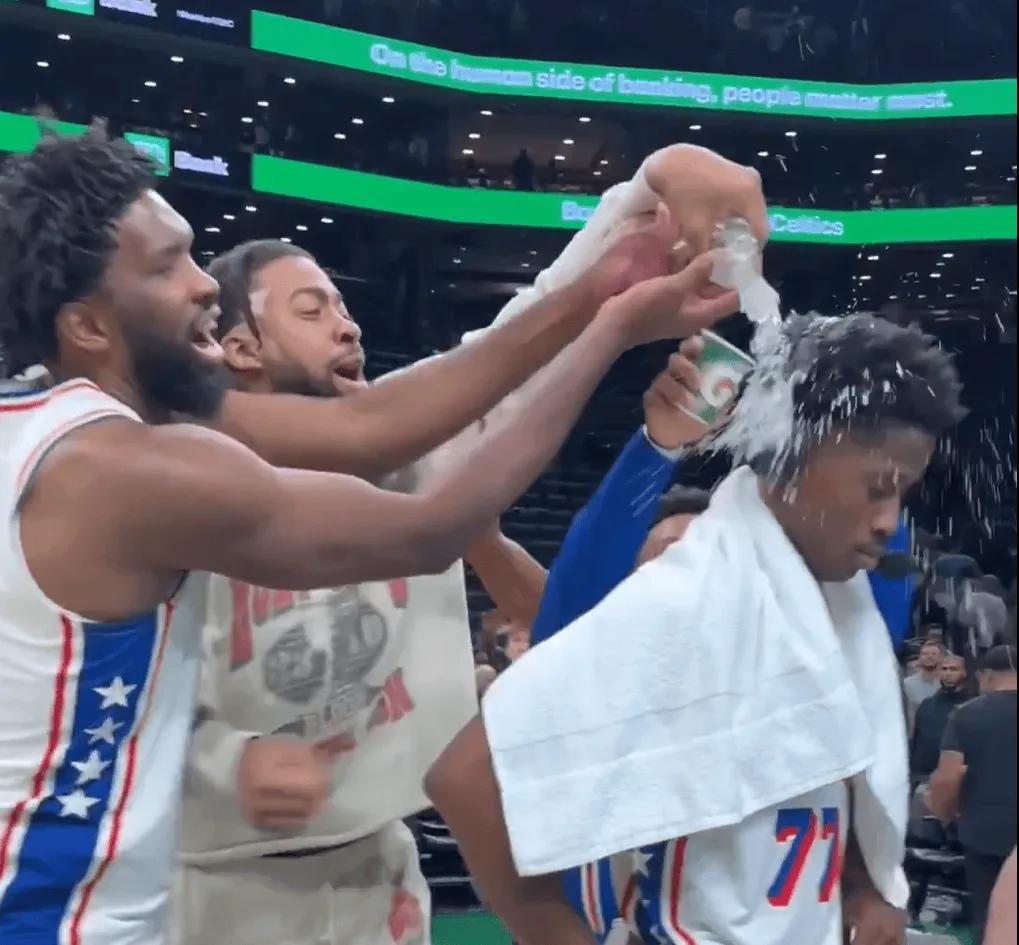 看图回答问题:76人老大是谁? 图中恩比德为新秀埃奇库姆浇水庆祝,本场比赛恩比德9中1,仅得到4分,正负值-16全队倒数第一。而“老大Vj”34分,第一节就14分,率领76人一分险胜凯尔特人,功不可没!