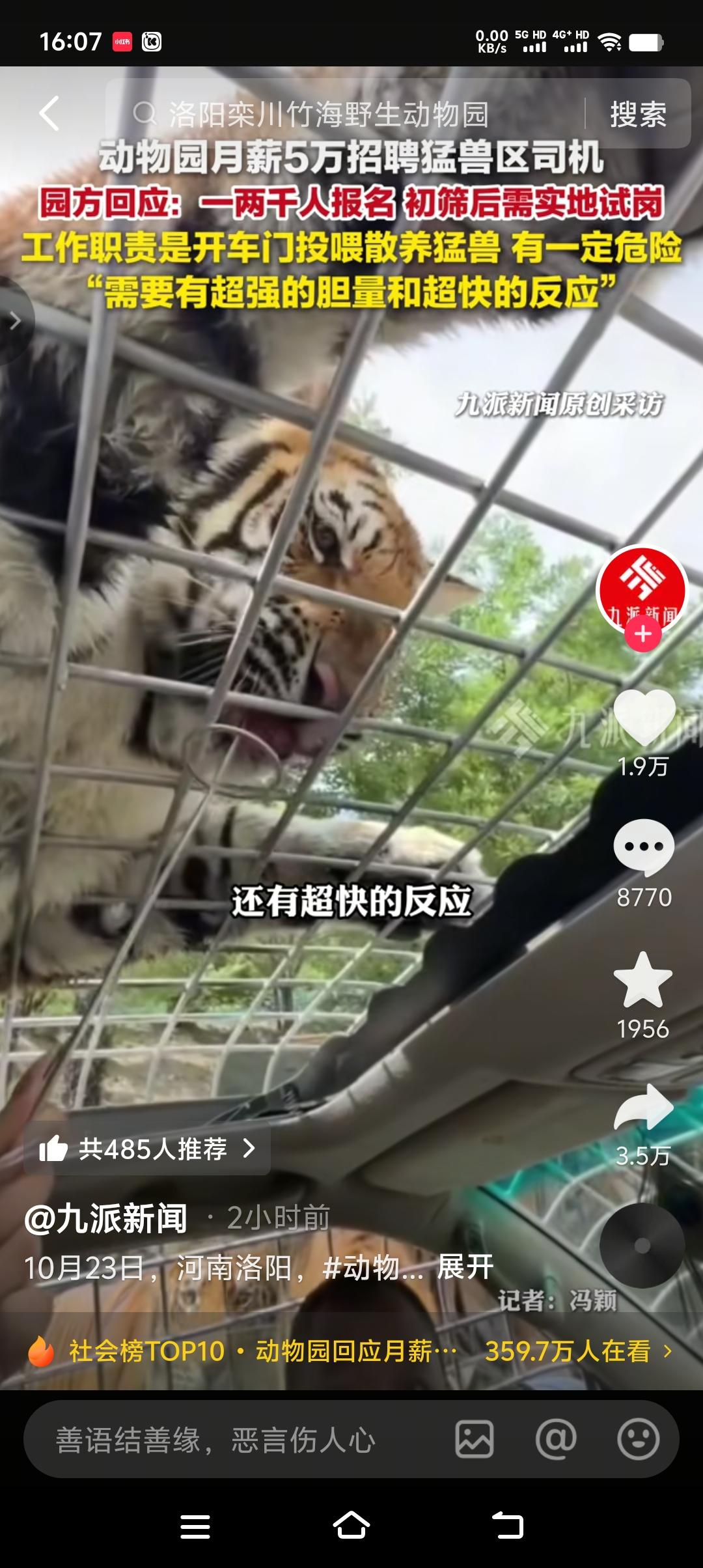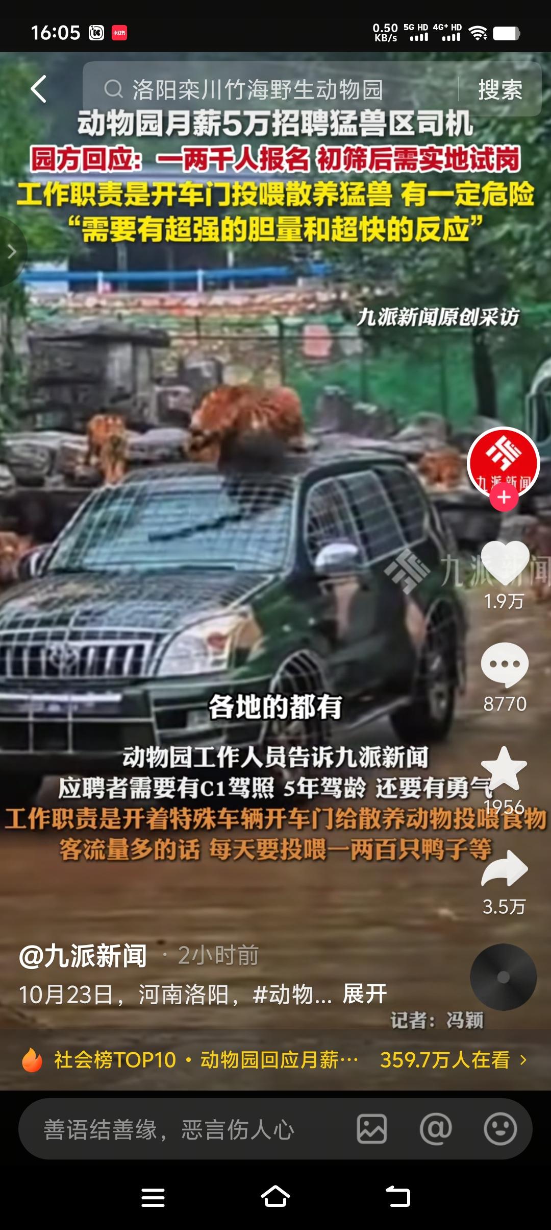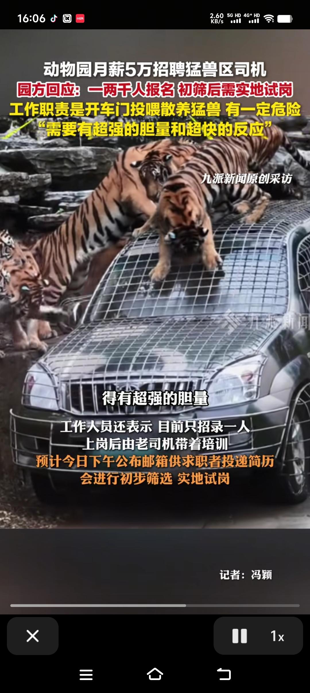 月薪5万,野生动物园招聘猛兽区司机,每天任务就是开特殊车辆进虎山熊窝近距离投食。不是简单的投下活食就行,而是主打一个近字,这样才能体现月薪5万的含金量,说白了就是为了博的游客眼球。 要求c1驾证,有五年驾龄,最主要的是有超强的胆量和勇气。只招一个,目前报名人数有一两千人,园区每天打电话的都打爆了,甚至有的自降月薪以此来谋求的这份工作。初试筛选后,再进行实地试岗,实地试岗才是最主要的,谁是好汉谁是软蛋在猛兽面前便知分晓。 明知山有虎,偏向虎山行。虽然在车里,但还是有很大的危险性,稍有分神很有可能成为老虎的盘中餐。所以说一年60万不是每个人都能胜任的,更不是每个人想胜任就能胜任的。