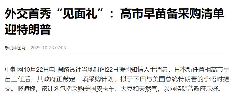 上台第二天,高市早苗就向特朗普表忠心,中国不买的东西,日本出钱买! 当地时间10月22日,日本新任首相高市早苗上任才第二天,其政府就赶紧敲定了一份针对美国的大额采购清单,打算在下周和美国总统特朗普见面时正式拿出来。 据日本共同社的消息,这份计划里主要是买美国的皮卡车、大豆和天然气,明眼人一看就知道,这就是想通过花钱买东西的方式,向特朗普政府表达友好的态度。 具体买些什么、买多少呢?皮卡车方面,主要选的是美国本土有名的品牌,预计要买下几千辆,这些车之后会用在日本国内的公共事业上,比如道路维修时拉设备、偏远地区运送物资之类的。 大豆的订单量更不少,可能要超过一百万吨,要知道美国本来就是全世界卖大豆最多的国家,这次日本买这么多大豆,直接能帮到美国中西部那些种大豆的农场主。不过要想填补我们空出来的市场,还是很有难度的,除非日本之后一年内一日三餐都吃大豆! 天然气则是打算签个长期的供应合同,涉及的钱可能有几十亿美元,这对美国能源企业来说,等于多了个稳定的大客户,对日本来说,也能让能源进口来源更多元一些。 而高市早苗之所以做出如此决策,自然少不了政治考虑。 这些年美日虽然是盟友,关系总体还行,但在做生意这块儿一直有不少矛盾,比如之前在汽车进出口、农产品关税上就闹过不少不愉快。 这次日本主动多买美国的东西,就是想缓和一下双方在贸易上的紧张气氛,为之后的合作铺路——毕竟接下来还想在安保合作、半导体产业链这些事情上让美国多支持支持。 美国农业部之前也说过,日本是美国农产品的重要买家,这次买这么多大豆,正好能帮美国农场主解决库存太多的问题,这一点也让双方都有了合作的意愿。 不过这个计划在日本国内也引起了不少讨论,不少经济领域的人有点担心,一下子买这么多美国商品,可能会对日本自己的相关产业造成冲击。尤其是农产品方面,日本国内的农业团体已经开始留意,这么多大豆进来会不会影响本土大豆的价格。 但日本政府这边表示,这次采购之前已经做了详细的市场调查,会在保证国内产业利益的前提下推进,还强调加强和美日的经贸合作,对日本长远的战略利益是有好处的。至于能不能完成这些设想还有待商榷。 其实靠多买美国东西来维持双边关系,对日本来说并不是第一次了,之前不同时期都用过类似的办法。比如几年前,为了缓和和美国的贸易摩擦,日本就曾增加过对美国牛肉、玉米的进口。这次高市早苗刚上任就推出这个计划,更能看出她对美日关系的重视。 而美国这边,这样的采购计划既能带动国内汽车、农业、能源等产业的发展,也符合特朗普政府一直强调的“美国优先”想法,所以双方在会晤时大概率会对这个计划达成一致意见。 只不过这个计划到底能让美日关系改善到什么程度,后续会不会出现新的问题,还得再看看事情的发展。