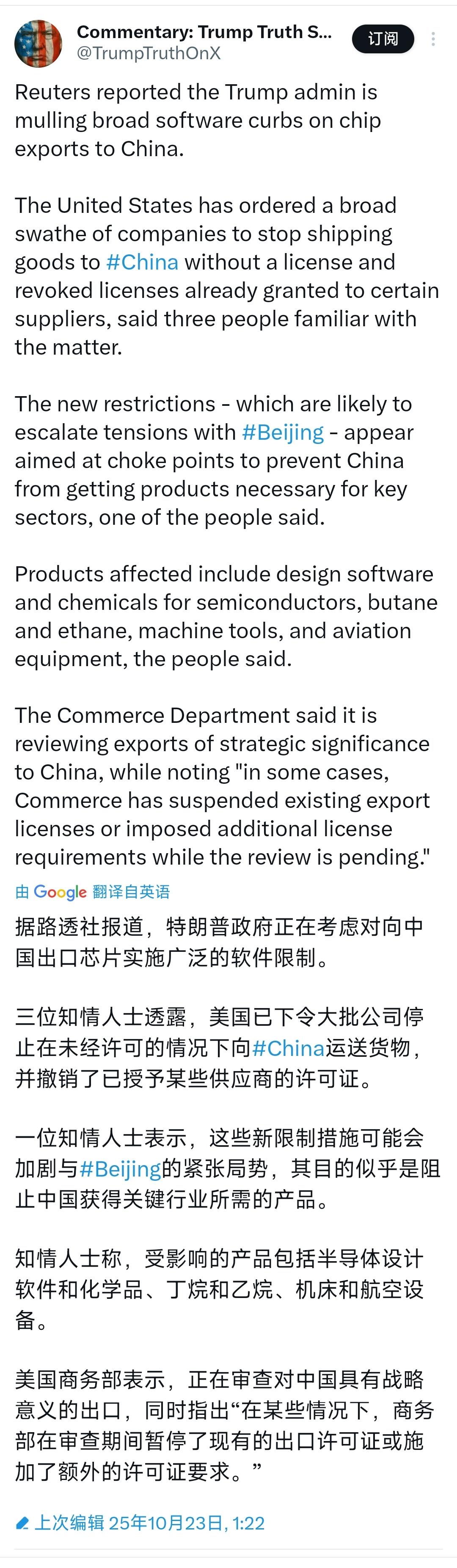 据路透社报道今天(10月23日),特朗普政府正在考虑对向中国出口芯片实施广泛的软件限制。 就在不久前,中国刚公布了对稀土相关技术的出口管制措施,涵盖稀土开采、冶炼到磁材制造等多个环节,而稀土是很多高科技产品的关键原材料,美国在这方面对中国依赖度不低,所以这个软件限制被看作是美国对中国稀土管制的回应。 所谓的软件限制,范围比想象中更广,不只是芯片设计用的专用软件,还包括那些靠软件驱动的产品,从我们常用的笔记本电脑,到工业用的喷气发动机都在考虑范围内。 美国财政部长贝森特已经确认这件事正在考虑中,还说可能会和 G7 这些盟友协调行动,但白宫和负责出口管制的商务部都没给出明确回应,态度很模糊。 其实美国在芯片领域对中国搞限制不是第一次了,之前拜登政府就针对先进芯片和制造设备出过管制措施,特朗普上任后政策一直在摇摆。今年 5 月底他刚对芯片设计软件加了新限制,7 月初又解除了,这次再提,不少知情人都说,这可能只是用来施压的手段,不一定真的会实施。 毕竟特朗普 10 月 10 号就在社交媒体上说过要对关键软件搞出口管制,但没给任何细节,现在披露的这些内容,更像是谈判前的造势。 要是真实施这样的限制,对中国的芯片相关企业确实会有影响。一直以来,中国不少芯片设计企业都得用美国的专用软件,没有这些软件,芯片的电路布局、性能测试这些关键步骤都没法做。不过也不用太担心,中国这些年一直在想办法应对,比如今年上半年,虽然美国管制加严,但中国半导体产品反而实现了逆势出口,在中东、东南亚这些地方打开了市场,价格也更有竞争力。 而且国内的软件研发也在推进,只是还需要时间才能完全替代进口的。 更值得说的是,这种限制对美国自己的伤害可能更大。美国对华出口的软件驱动产品每年能带来不少收入,2024 年的时候,这些产品和相关服务费加起来超过 120 亿美元,占了美国总出口额的 10% 以上。 之前对芯片的限制已经让英特尔、英伟达吃了大亏,今年上半年英特尔销售额降了 15%,英伟达的主力芯片销量跌了 20%,利润直接腰斩。 要是扩大到软件领域,美国科技企业的损失会更严重,有估算说短期内可能损失超过 500 亿美元,还会让 10 万美国人失去工作,这对美国经济和就业都是不小的打击。 美国国内反对的声音也很大,英伟达的 CEO 黄仁勋就多次劝阻,觉得这种管制政策根本没用,反而会让中国企业更有动力搞自主研发,最后美国企业会失去市场,还培养出竞争对手。连美国前贸易官员都觉得,保持一定的技术差距,中国企业可能还会依赖美国,现在彻底封锁,反而断了这条路。而且政府内部也有分歧,不少人倾向于更温和的方式,不想把贸易对抗升级。 从国际上看,美国想拉着盟友一起干也不容易。之前拜登政府和荷兰达成过口头协议,限制芯片设备维护,但特朗普上台后荷兰就反悔了。现在贝森特说要和 G7 协调,但盟友们也有自己的利益考虑,不会轻易跟着美国牺牲自己的市场。 中国驻美使馆已经明确表示反对这种单边的管制措施,说要是美国继续走错路,中方会采取果断措施保护自己的权益。 外交部也多次提到,美国把经贸科技问题政治化,最后只会反噬自身,损害的是双方的利益。 现在离中美第五轮经贸谈判和可能的元首峰会不远了,美国这个时候放出消息,更多是想在谈判桌上多要些筹码,就像知情人说的,大概率是 “雷声大,雨点小”,真要全面实施的可能性不大。 不管最后结果怎么样,这件事也提醒我们,关键技术和软件还是得靠自己,只有自主研发跟上了,才能不受制于人。这些年中国在这方面的投入一直在增加,虽然短期内会有困难,但从长远看,也是推动产业升级的动力。 而美国要是一直用这种封锁的办法,不仅会伤到自己的企业,还会破坏全球的产业链,毕竟现在的科技产业都是相互关联的,没有哪个国家能完全独立发展。