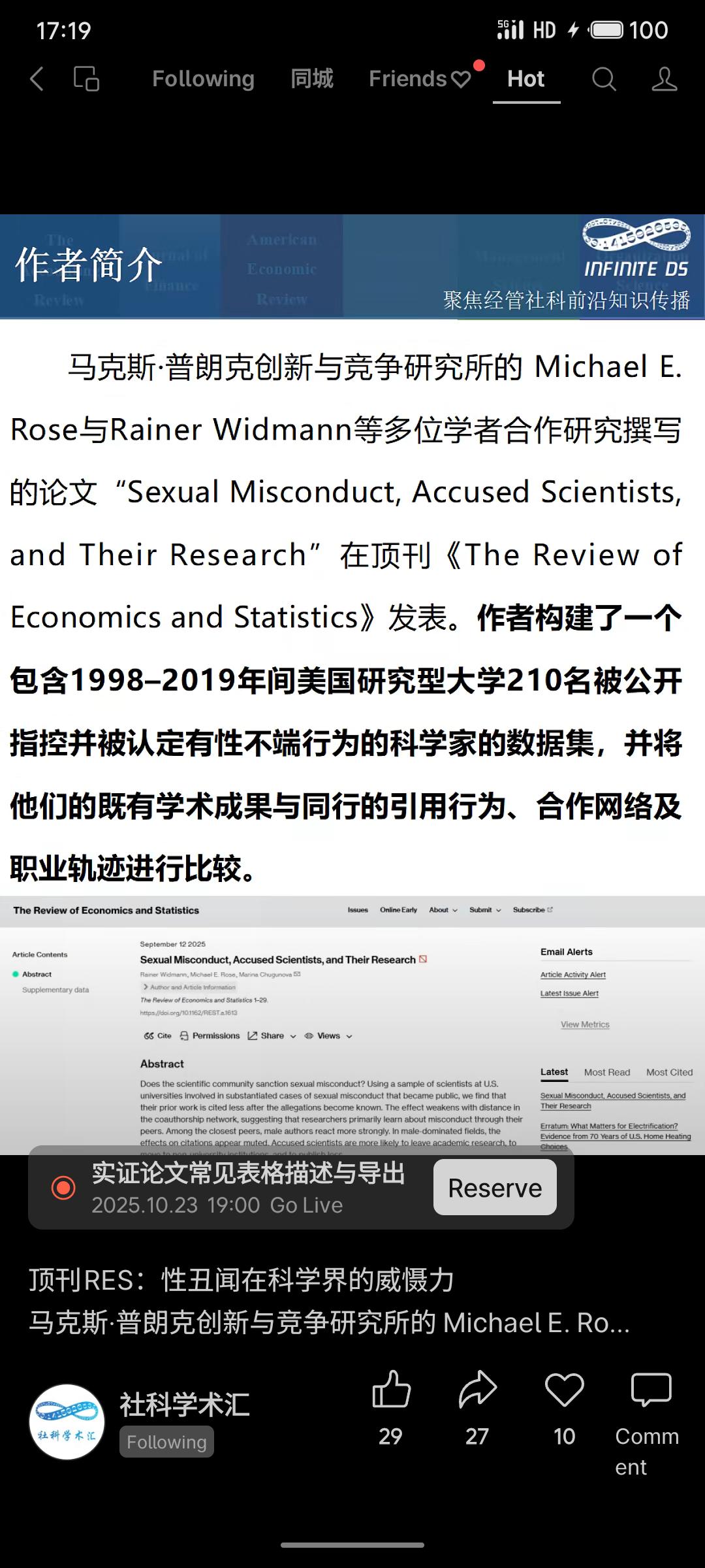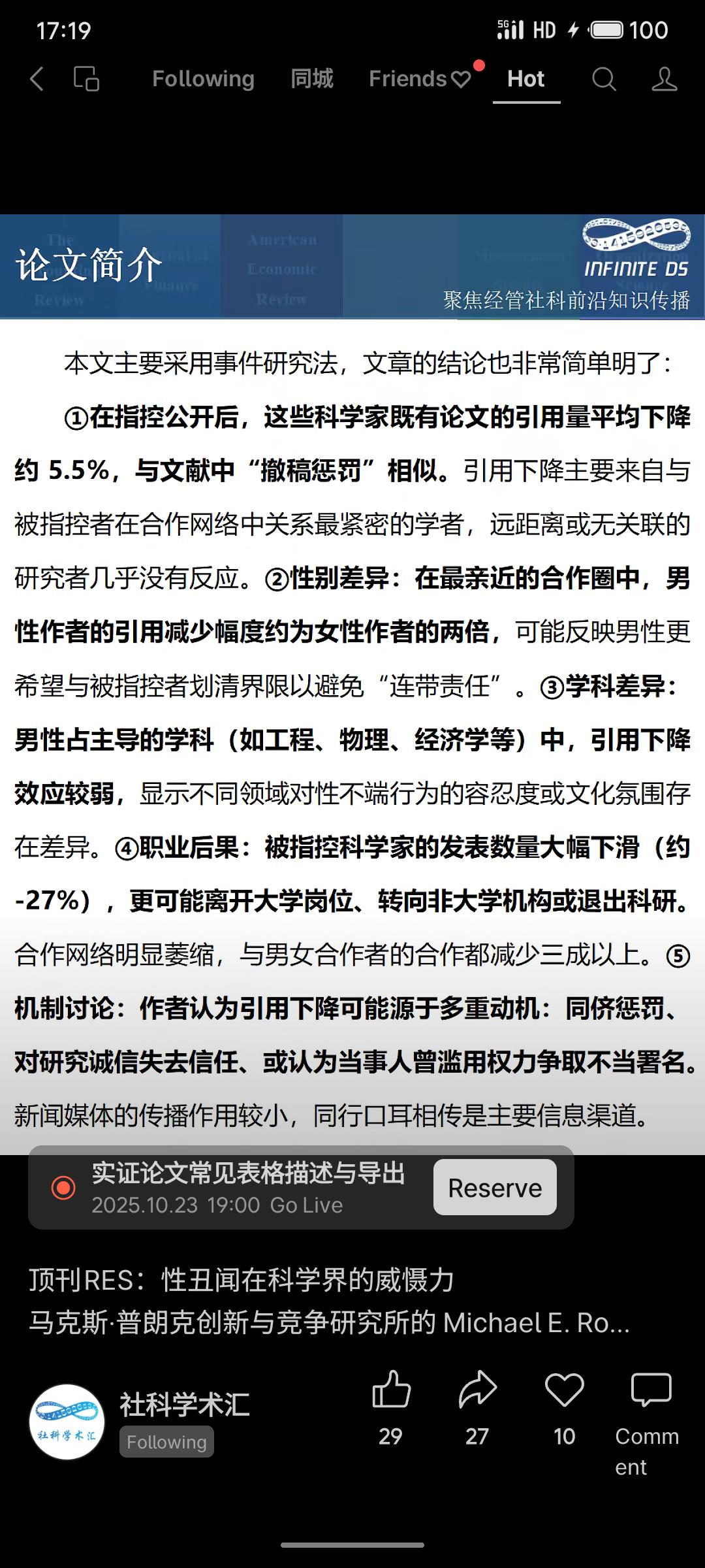 研究通过分析210名被认定存在性不端行为的科学家数据发现,指控公开后其论文引用量平均下降约5.5%,且其亲密合作者(尤其是男性)的引用减少更为明显。被指控者论文发表量大幅下滑,职业轨迹受挫,更多离开大学。研究揭示了学术圈对性丑闻的内部惩罚机制。