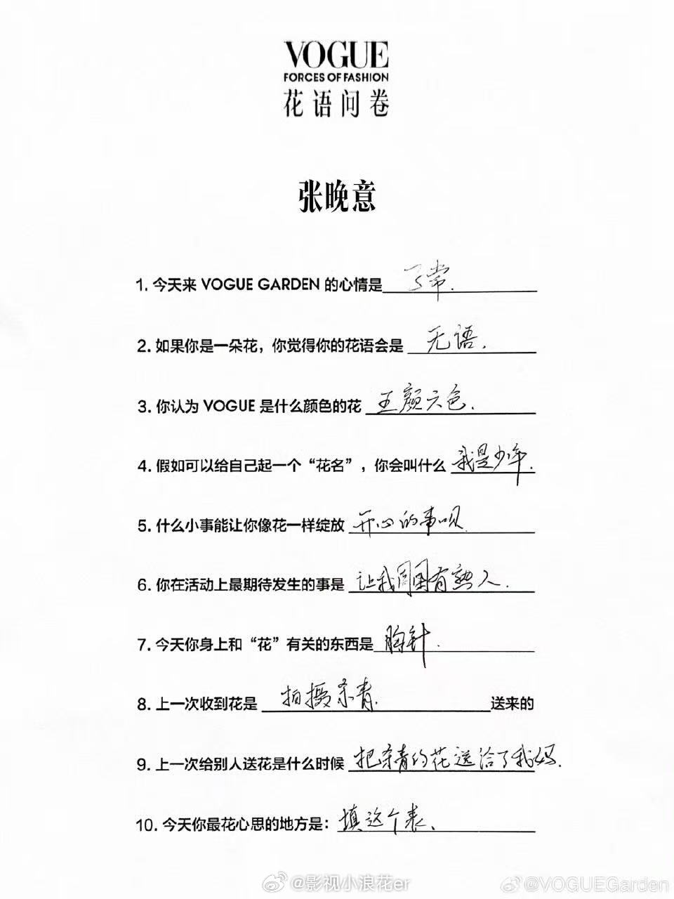 张晚意的花语是无语 喜剧人实锤!VOGUE 填 “无语” 花语,低头写字的认真模样,像极了搓防晒成面团时的一本正经!