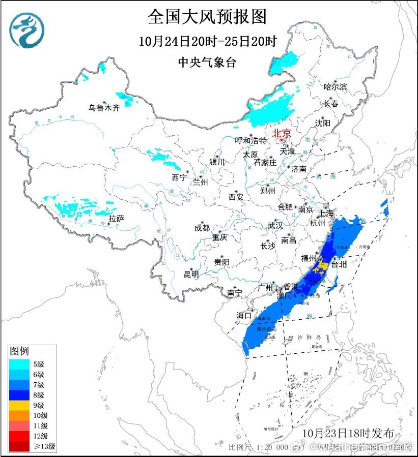 今天18时中央气象台发布大风蓝色预警:预计,10月23日20时至24日20时,东海大部海域、台湾海峡、台湾以东洋面、南海北部和中西部将有7~8级、阵风9级的大风,其中台湾海峡风力可达9~10级,阵风11级。