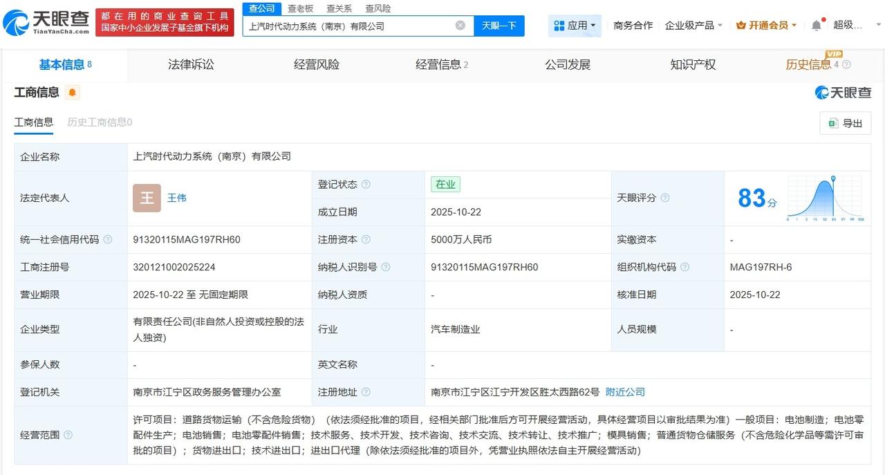 上汽时代在南京成立动力系统公司注册资本5000万 天眼查App显示,近日,上汽时代动力系统(南京)有限公司成立,法定代表人为王伟,注册资本5000万人民币,经营范围包括电池制造、电池零配件生产、电池销售等。股权全景穿透图显示,该公司由上汽时代动力电池系统有限公司全资持股,后者由上海汽车集团投资管理有限公司、宁德时代新能源科技股份有限公司共同持股。 天眼查信息: