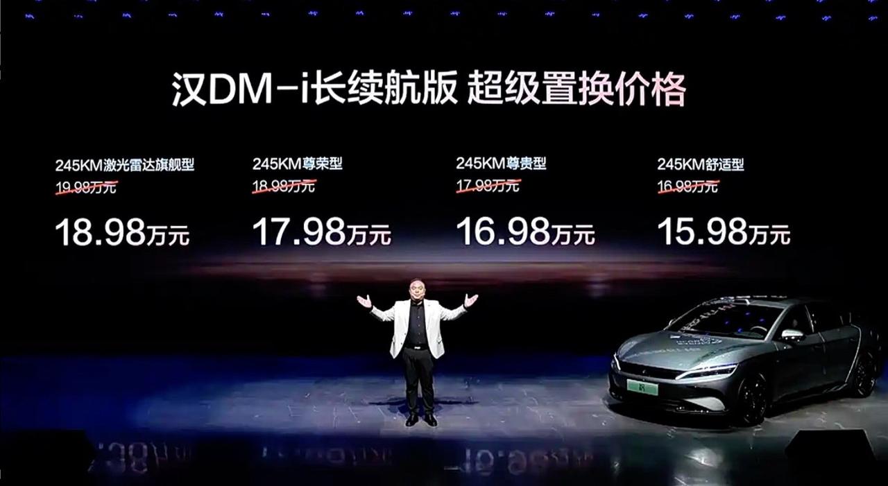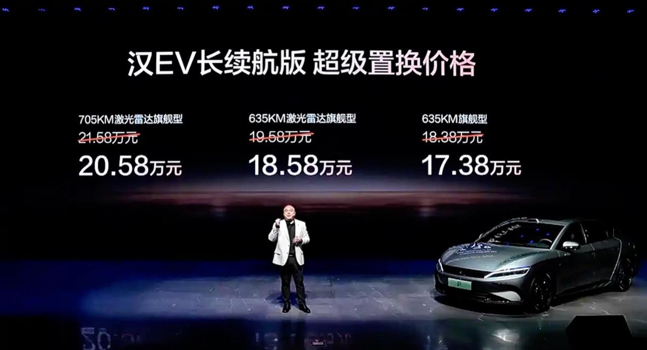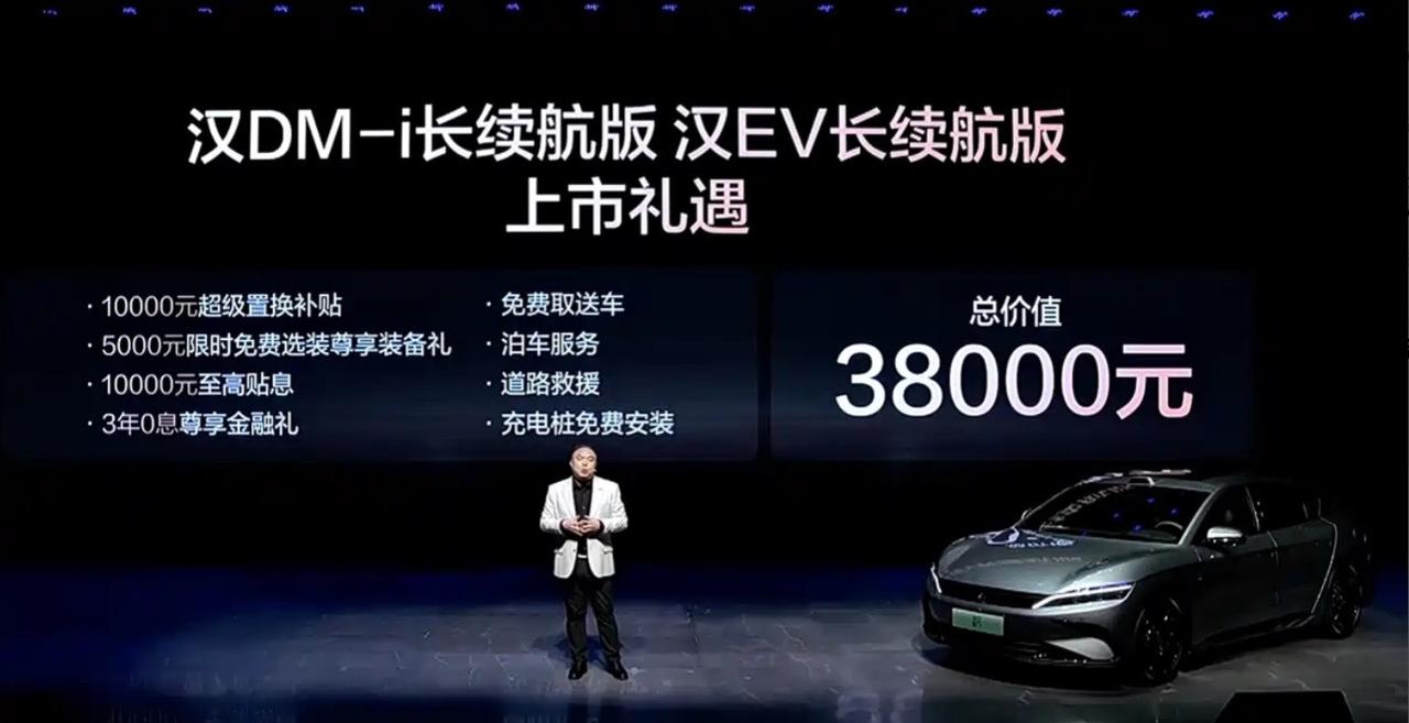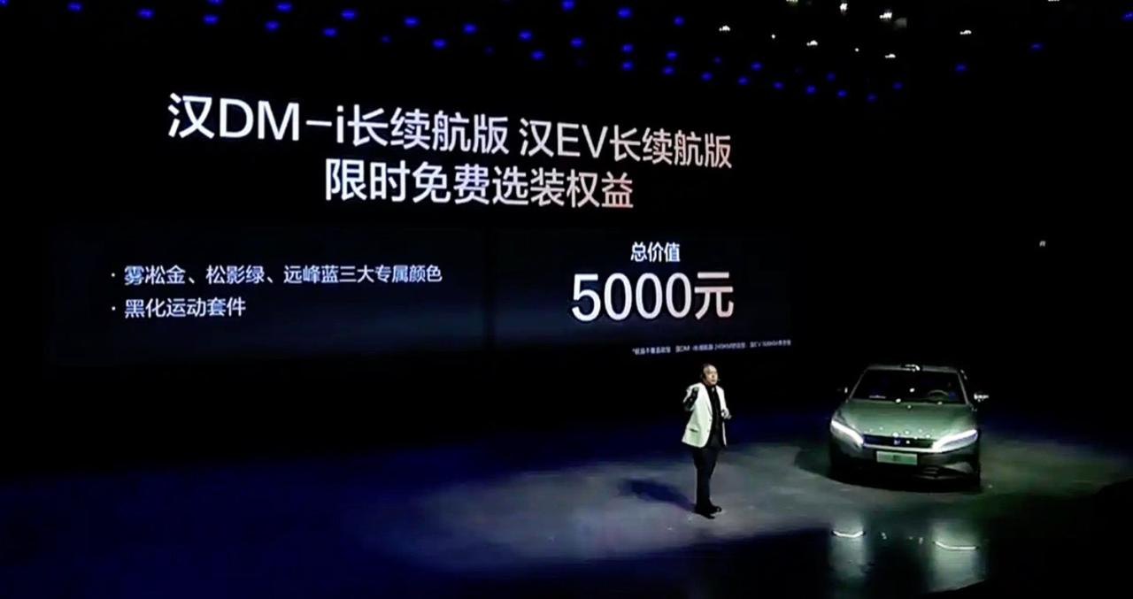 10月11日,比亚迪汉长续航版上市,新车共计推出7款车型,官方指导价个16.98-21.58万元。长续航版将推出总价值3.8万元的上市礼遇,此外,汉EV 506km尊贵型推出1万元置换补贴,惊喜价15.98万元。汉DM-i长续航版纯电续航245km,汉EV长续航版纯电续航635km和705km,同时新车设计有所调整,配置优化提升。新车定位为一款中大型车,有插混和纯电动力可供选择。发布会上比亚迪王朝网销售事业部总经理路天透露,近期将为汉进行油耗OTA升级,馈电油耗将降至3.35L/100km。比亚迪汉 天神之眼B 发布会 选车指南