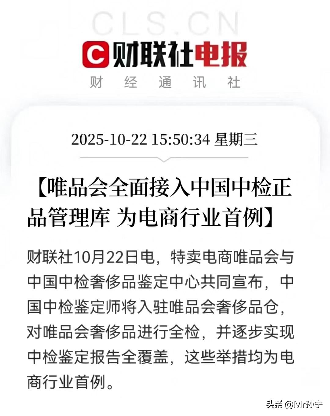 电商行业曝出一个大消息,双11迎来最大变数! 就在昨晚,中国中检突然宣布,入驻唯品会奢侈品仓,对所有高端消费品进行全检,实现一物一鉴一报告。什么意思?也就是说,未来你在唯品会买的任何一个奢侈品,都在卖给你之前,就已经进行了全检鉴真,打上了中检的标。 这是整个电商行业,乃至奢侈品行业都没有干过的事。以前是什么?你在电商买奢侈品,只能实现“抽检、送鉴”。坦白讲,你手里拿得奢侈品包包,并不一定被鉴真过。消费者只能售后求证,也就是拿到手里了,自己再想办法求证,这显然是有漏洞的。 如今,中检和唯品会这一步,等于实现了,奢侈品电商消费从“售后求证”到“售前全量鉴真”的跨越。据我了解,中检会直接派驻鉴真师直接入驻到唯品会湖州、郑州两大奢侈品仓,对所有进来的货物进行全量三次交叉鉴定。 坦白讲,以前买奢侈品,更多都是去线下。线上唯一的担忧,就是鉴真问题。而且以前买奢侈品,并不追求价格低,反而是越贵越好。如今,鉴真问题解决了,加上平台本身就有折扣性价比,我认为未来在折扣平台买奢侈品会是新的消费趋势。 据透露,不仅是包包,还会向服饰、珠宝等领域覆盖。所以,双11的竞争、电商的比拼,并不只是比规模,比GMV,还有提升信任、强化服务、解决消费者迫切关心的难题。中检这一步,迈出了首例,也推动了电商行业的高质量发展!