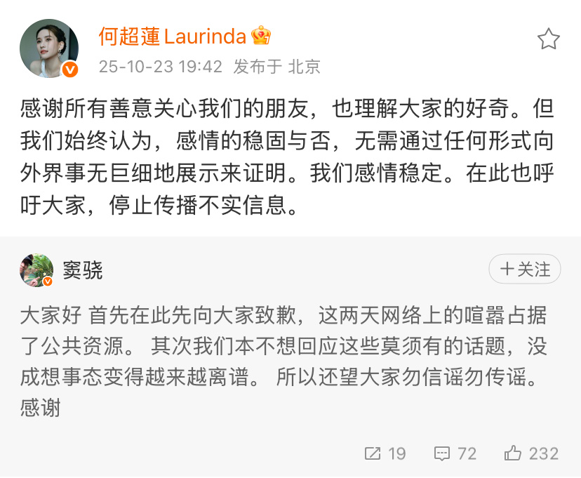 窦骁发文回应何超莲 我们感情稳定