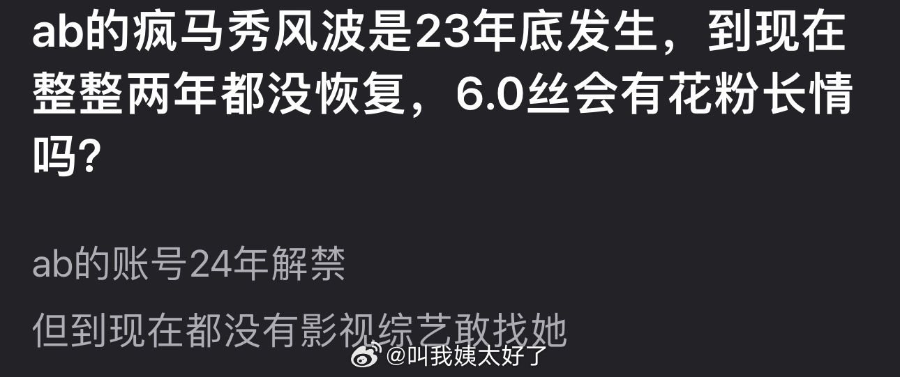 ab的风波是23年底发生,账号24年解禁,到现在整整两年都没恢复,没有影视综艺敢找她,大家感觉6.0丝会有花粉长情吗?
