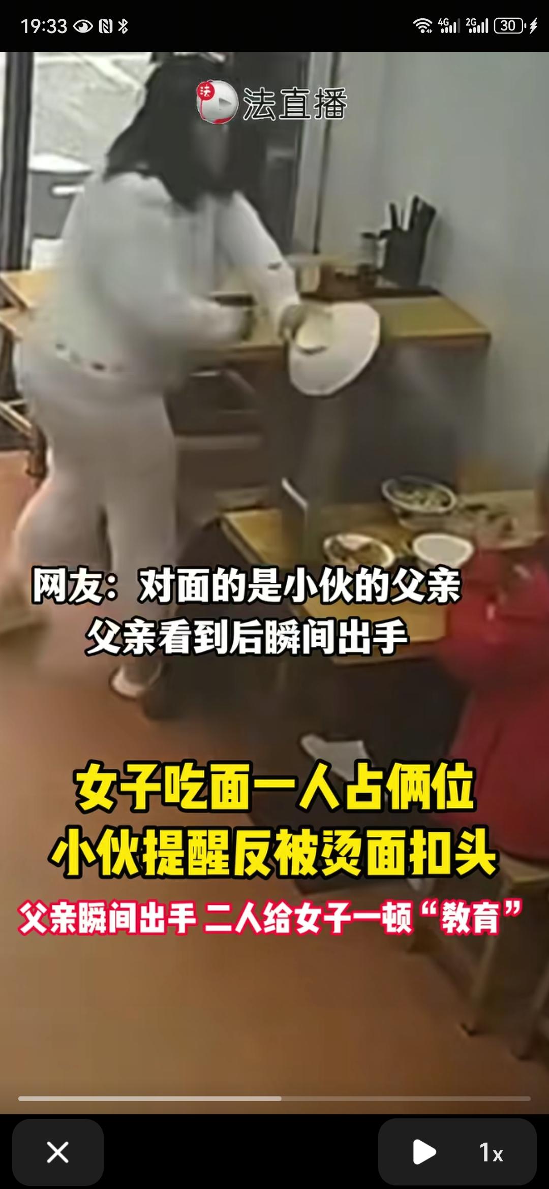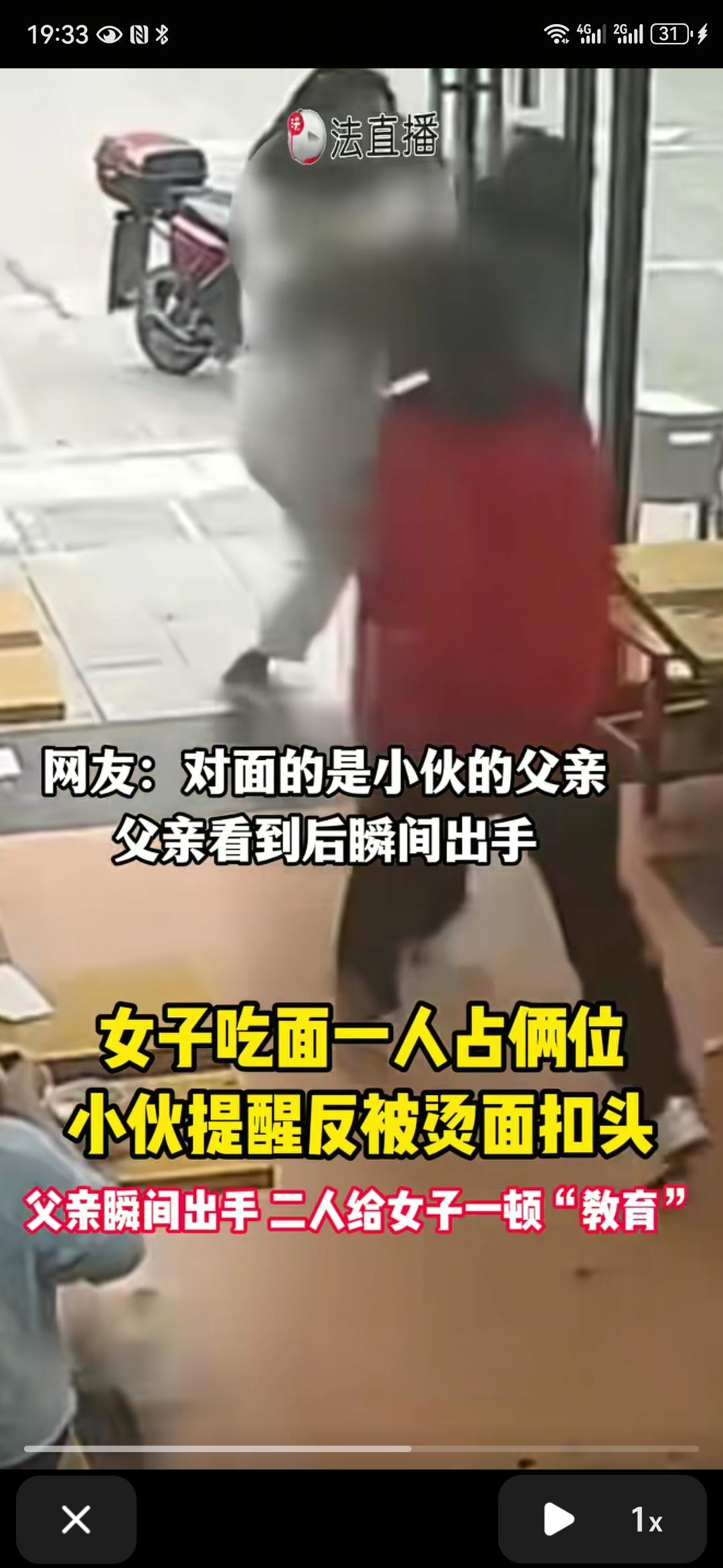 胖仙女好威武啊,一言不合就把滚烫的面汤扣在小伙头上,扣完就跑。幸亏小伙的爸爸在,要不然就被胖仙女吓住了。父子俩追上胖仙女拉扯,注意,是拉扯,不是暴打,说明父子俩是善良的人。要是使用暴力,两个男的打一个女的,那不跟大砍刀切小鸡仔一样利索啊,胖仙女哪还有走路的力气。小伙最后报警,希望小仙女受到法律的制裁。 建议法治频道对此跟踪报道,对“仙女”行为予以震慑和警示。