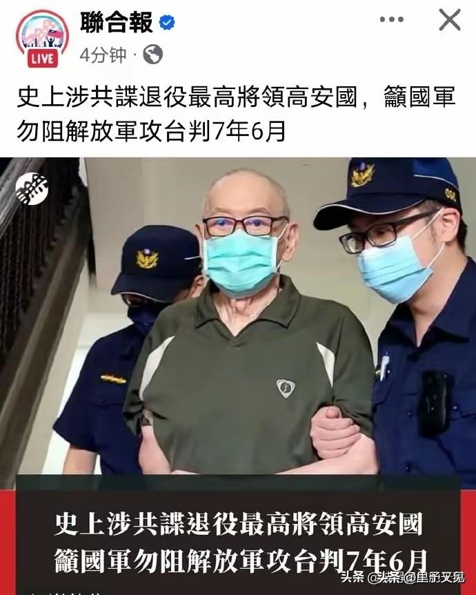 台湾当局对支持统一的台湾同胞赶尽杀绝。台湾的高安国将军今天被台湾当局判处了7年6个月徒刑。高安国将军已经是80多岁了,因为他呼吁国家统一,所以被判刑。台湾到今天仍然是白色恐怖。为了尽快解救如高安国将军等受台独迫害的爱国人士,都很有必要加快统一大业步伐!当务之急是立刻解放台湾省,及时营救像高安国将军这样被判刑的支持国家统一的爱国台湾人士。