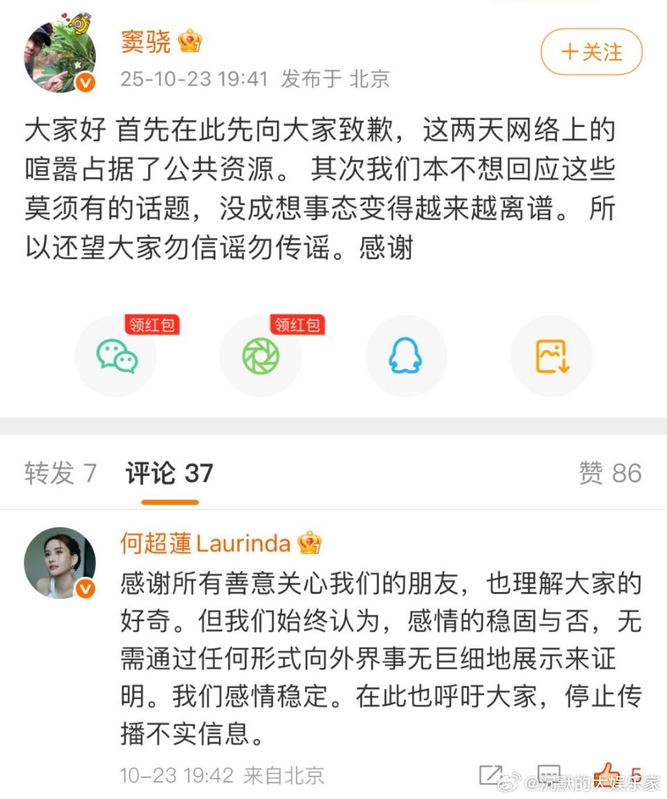 2025年10月,关于两人婚变的传闻甚嚣尘上。有报道称两人已分居数月,且尚未领证,何超莲还被曝没有生仔计划。面对这些传闻,窦骁和何超莲终于出来回应:“我们本不想回应这些莫须有的话题,没成想事态变得越来越离谱”,还望大家勿信谣勿传谣,“我们感情稳定”。
