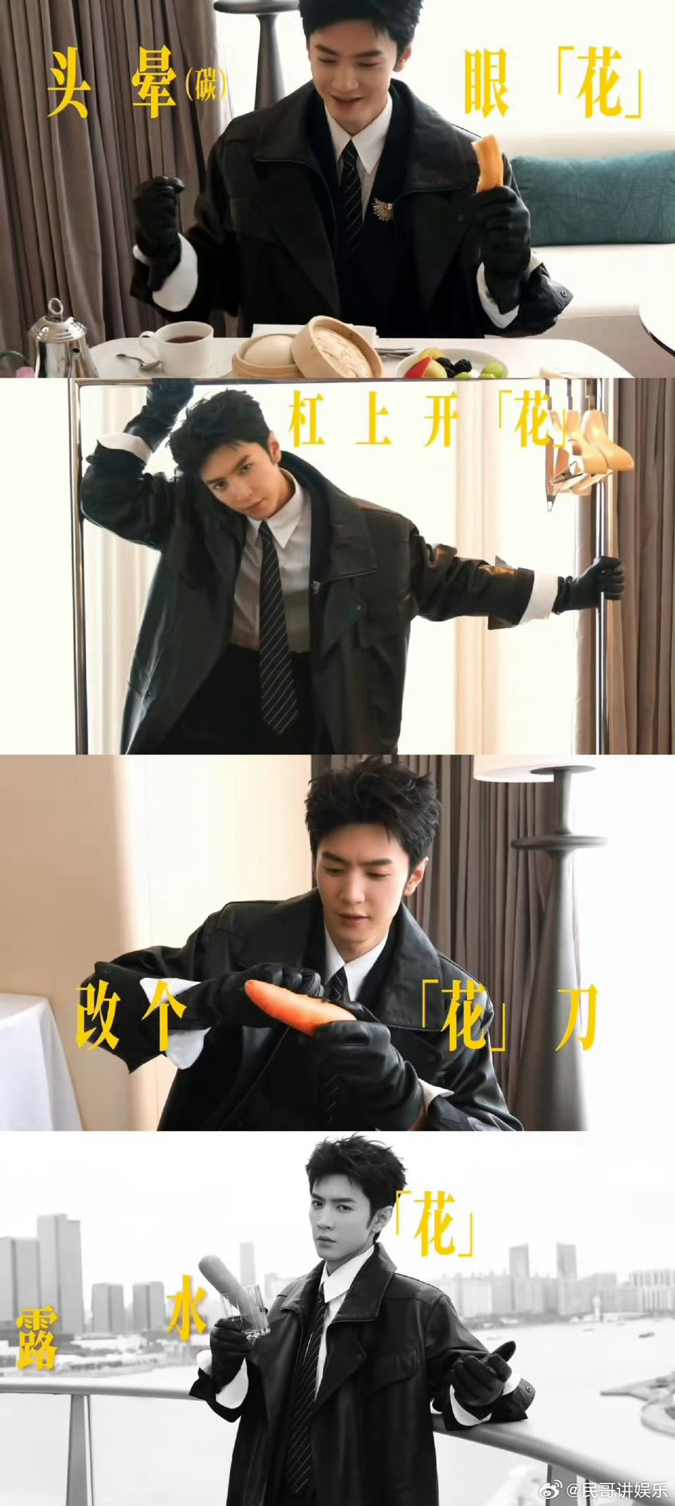 陈哲远每次出发图都这么抽象 陈哲远出发图抽象感又升级!之前是Hello Kitty头套配西装、素颜吃火锅刷牙,这次黑风衣皮手套玩梗不停:杠上开花、画花公子,戴皮手套吃油条更是抽象大赏,拍的出发图超新!