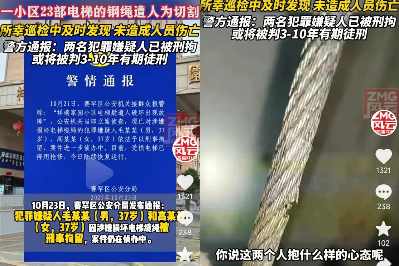 大快人心!呼和浩特割坏电梯缆绳的两个人已经抓到了。警方的通报是一男一女两个人,都是37岁。 这哪是破坏设施,分明是拿几百号人的命赌运气。 幸亏检修员及时发现,不然早酿成大祸,想想都后背发凉。 有人猜是物业纠纷,可再大的矛盾也不能拿公共安全撒气啊。 这俩人怕是没搞懂,割电梯绳不是赔钱的事,已经犯了以危险方法危害公共安全罪,3到10年的牢饭跑不了,严重了甚至可能判死刑。 就算赔得起维修费,这一辈子的污点也洗不掉,家人在小区更是抬不起头。 这事最该警醒的是,公共安全从来不是“别人的事”。 俩业主的自私,害得全小区爬楼梯,还得担惊受怕。 你说不管出于啥动机,这种拿他人安危当筹码的行为,是不是该重判? 大家觉得呢?