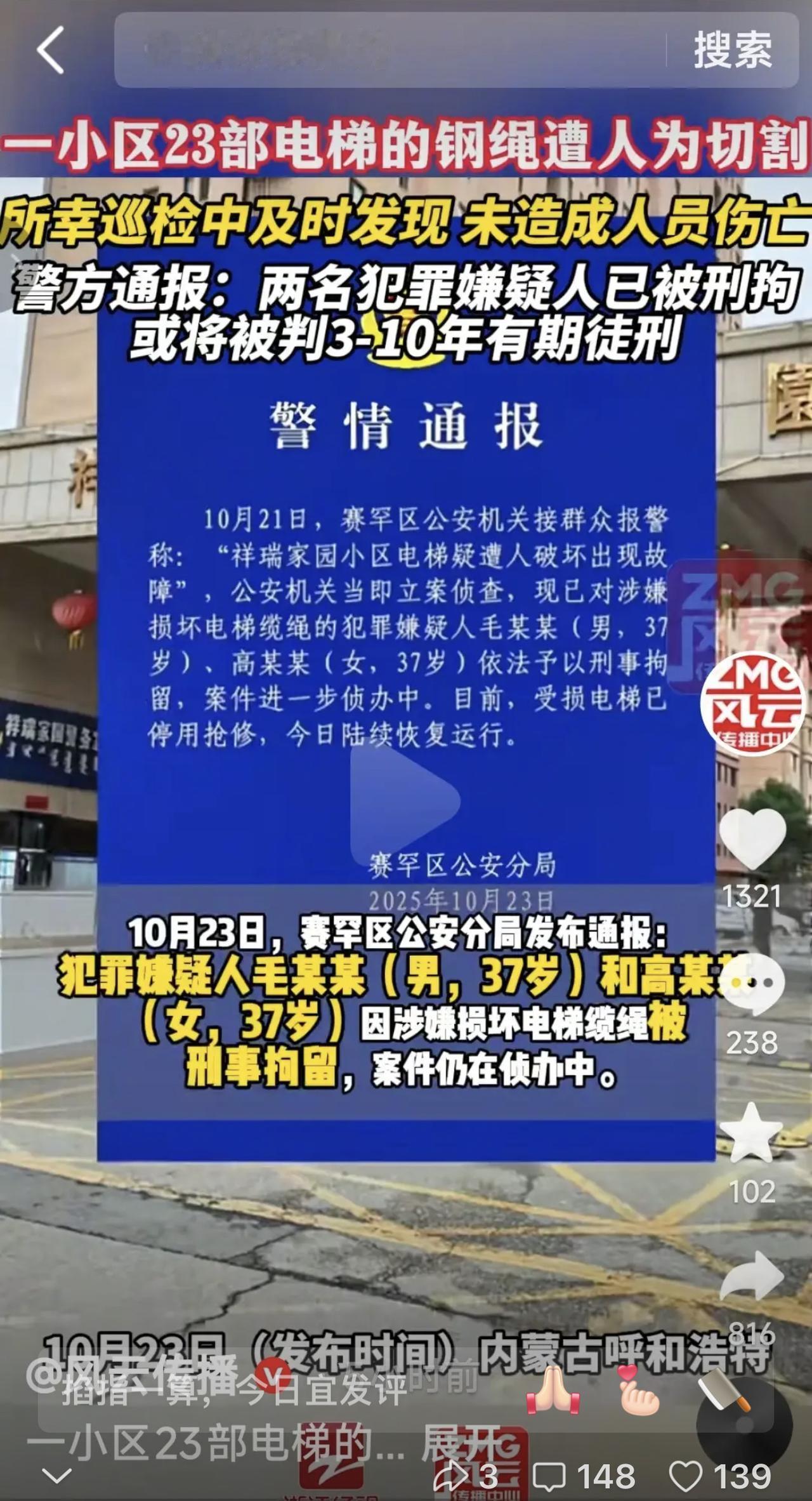 大快人心! 呼和浩特割电梯缆绳的俩嫌疑人终于落网,还是小区里的业主,一男一女全3