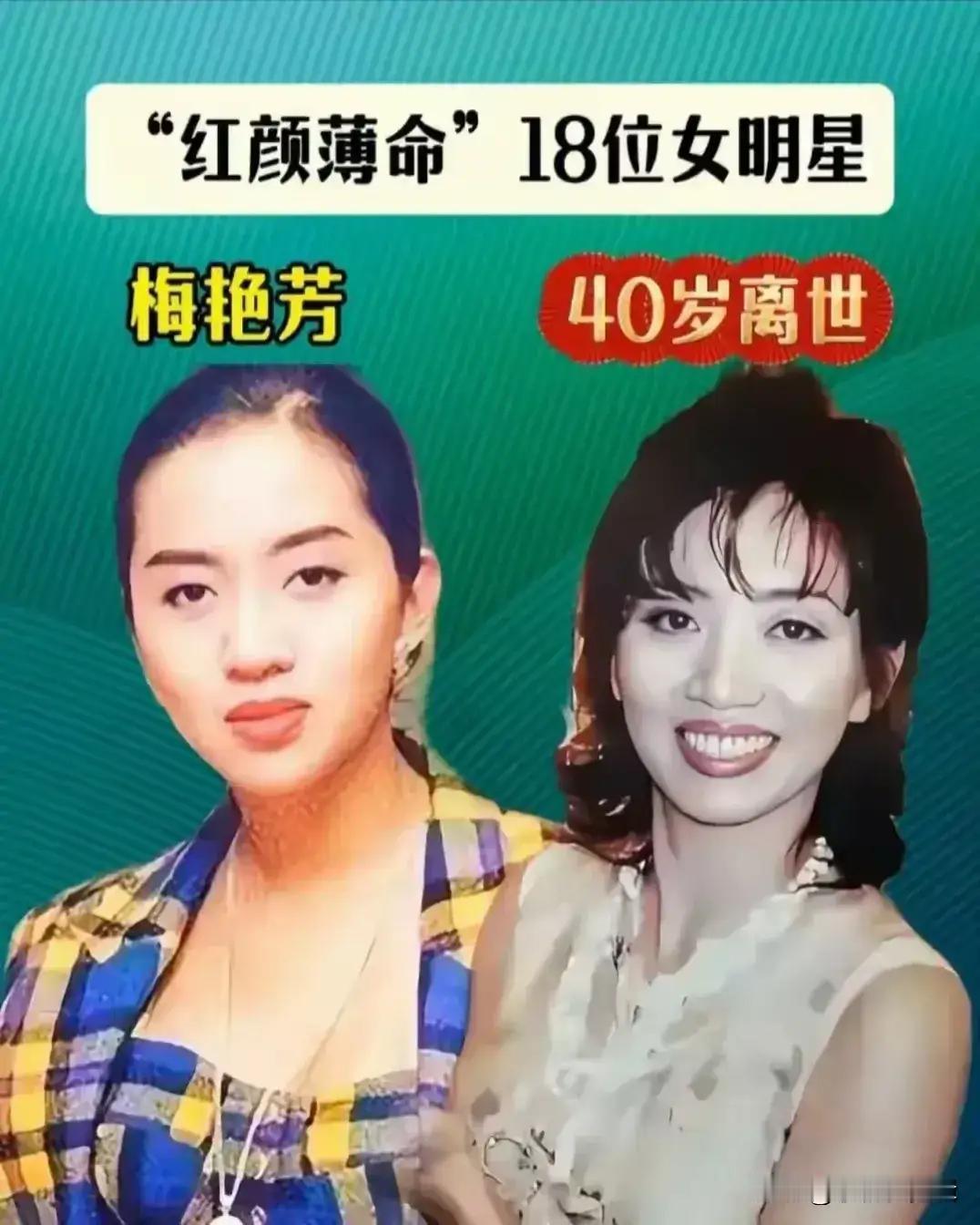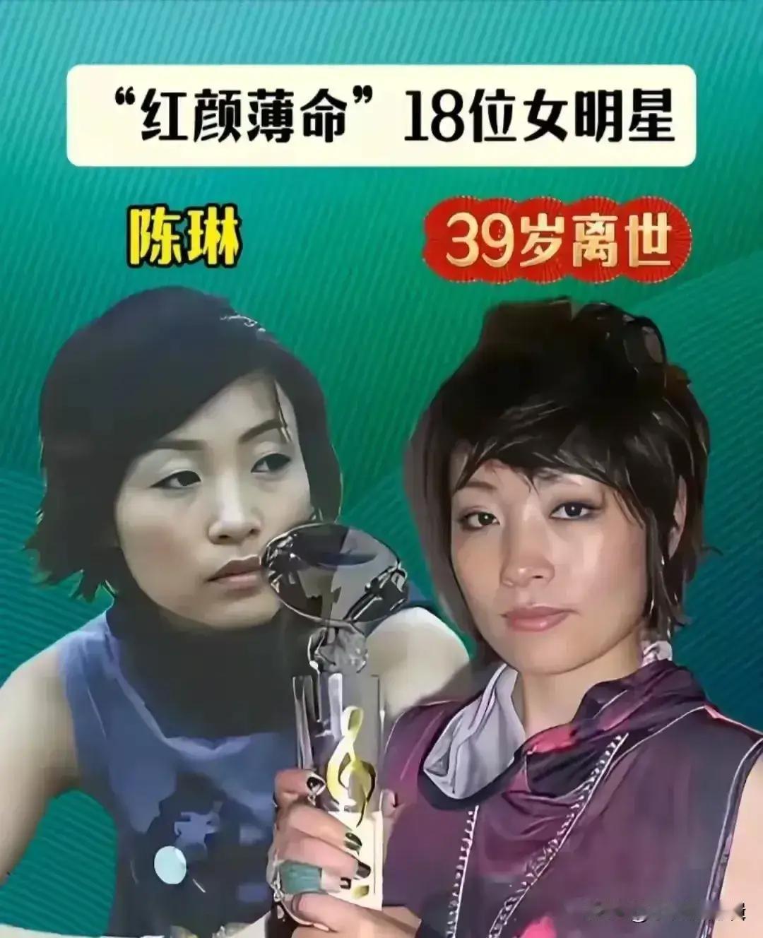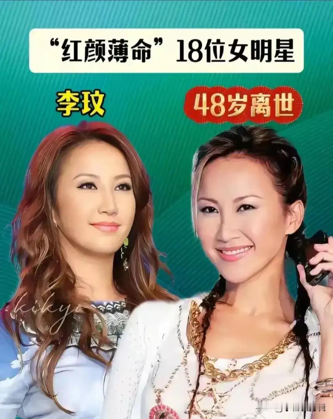 香消玉殒的陈晓旭。 香消玉殒的陈琳。 香消玉殒的李婷。 香消玉殒的梅艳芳。 香消玉殒的李钰。 香消玉殒的陈宝莲。 香消玉殒的李玟。 香消玉殒的罗慧娟。 香消玉殒的翁美玲。 这些娱乐圈女明星们,她们曾经都爆火过,然而在最美的年纪都香消玉殒,离开了人世,让人感到非常的遗憾和痛心,就比如说陈晓旭,大家一提到她就会想到她所饰演的林黛玉,仿佛她就是为这个角色而生,本该有着大好前途的她却不幸患病离世,将生命定格在了最美好最美好的年华。