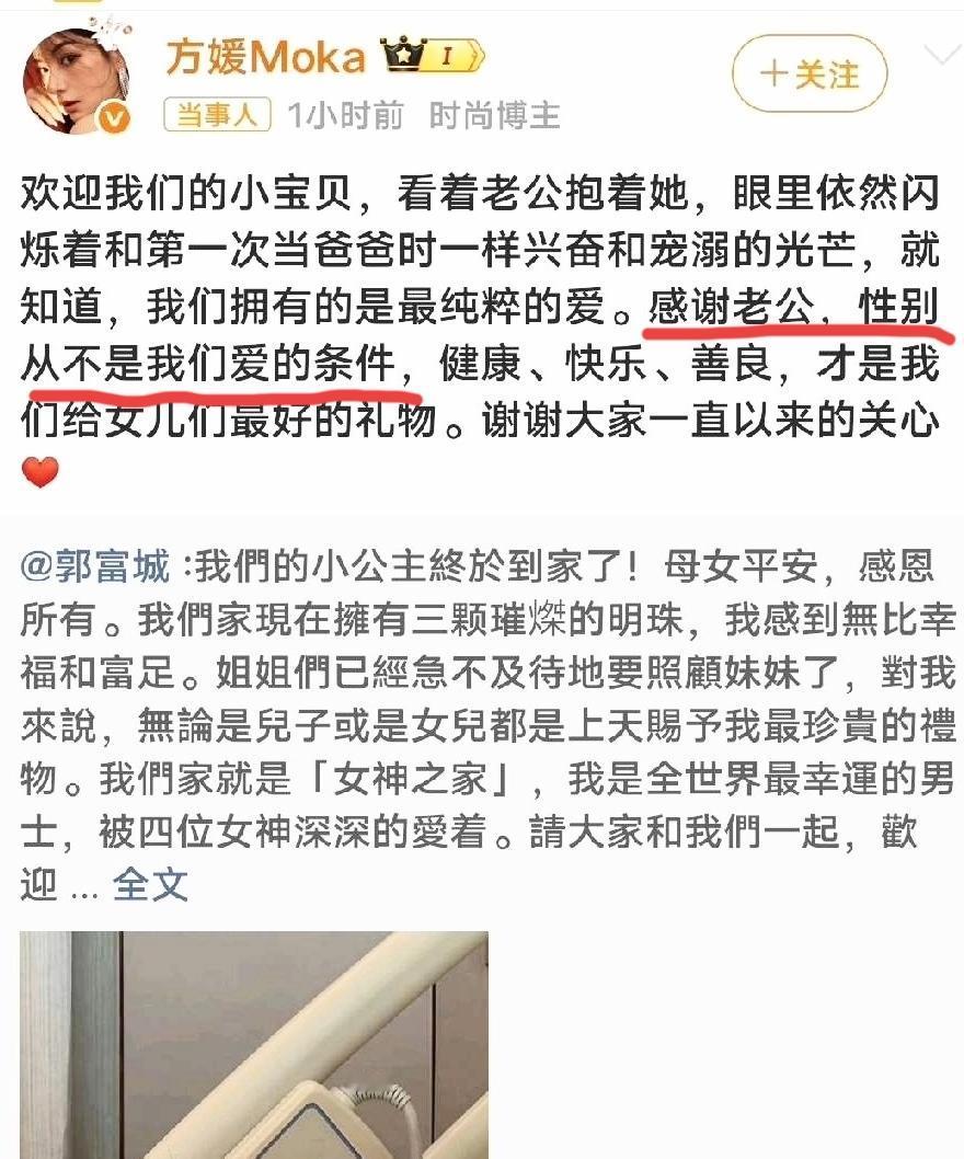 郭富城又生一位千金,吃瓜网友却比当事人还操心[笑哭]!讨论郭天王连生三个女儿,是不是就要个儿子才甘心?方媛也发文庆祝,不过看她文中的意思,估计是想说心里有些不安,怕郭富城会感到失望[机智]。 不过郭富城对她的喜爱,可是丝毫未减。精心给她选月子中心,亲自贴心照顾她。看来人家夫妻是乐在其中,这“五口之家算是圆满了”[赞]! 那些说赶着生儿子的说法,也就不成立了。以后要不要生四胎,他们两个人自己决定就好,网友们也就别操心了。你对这事咋看?留言聊聊吧[灵光一闪]。