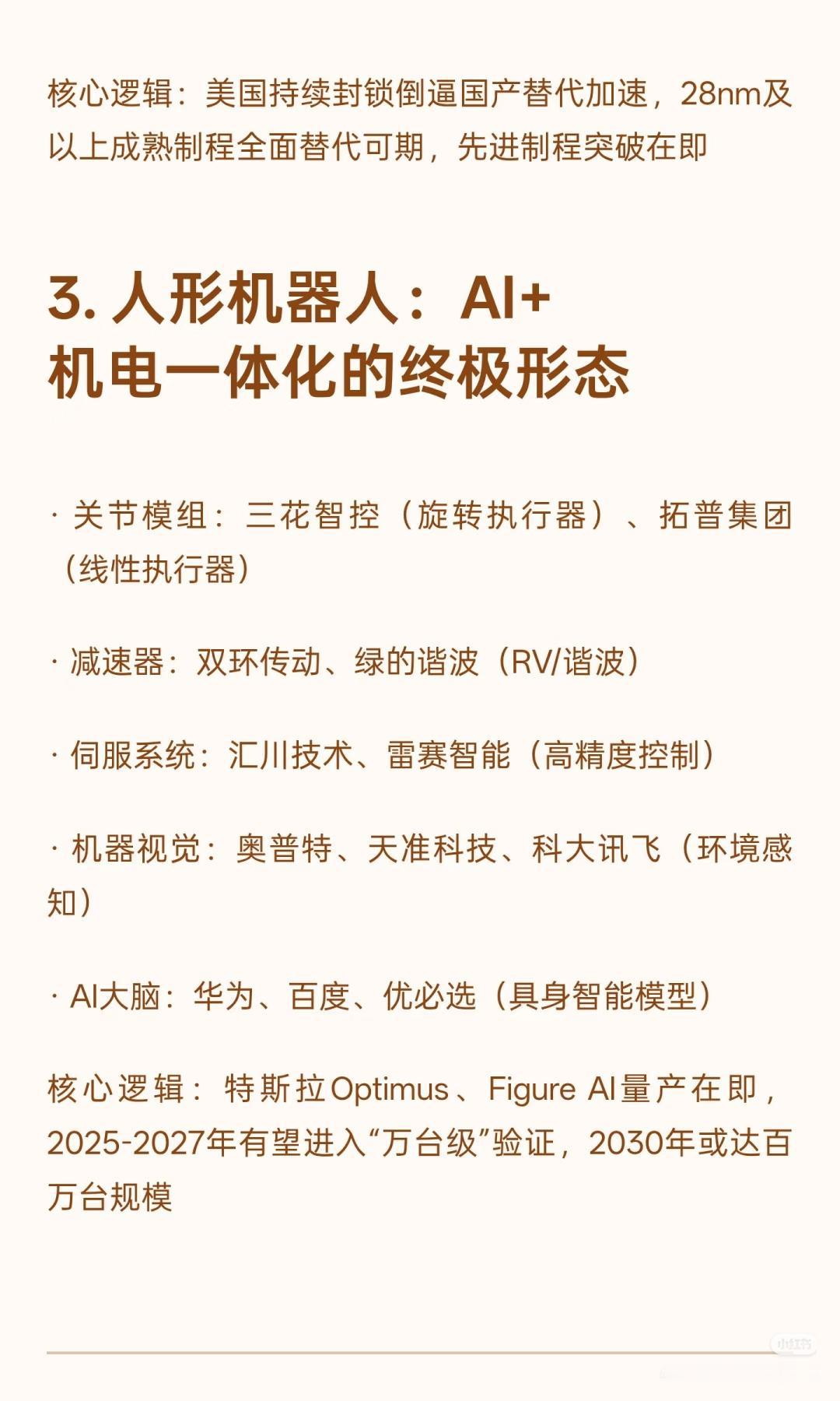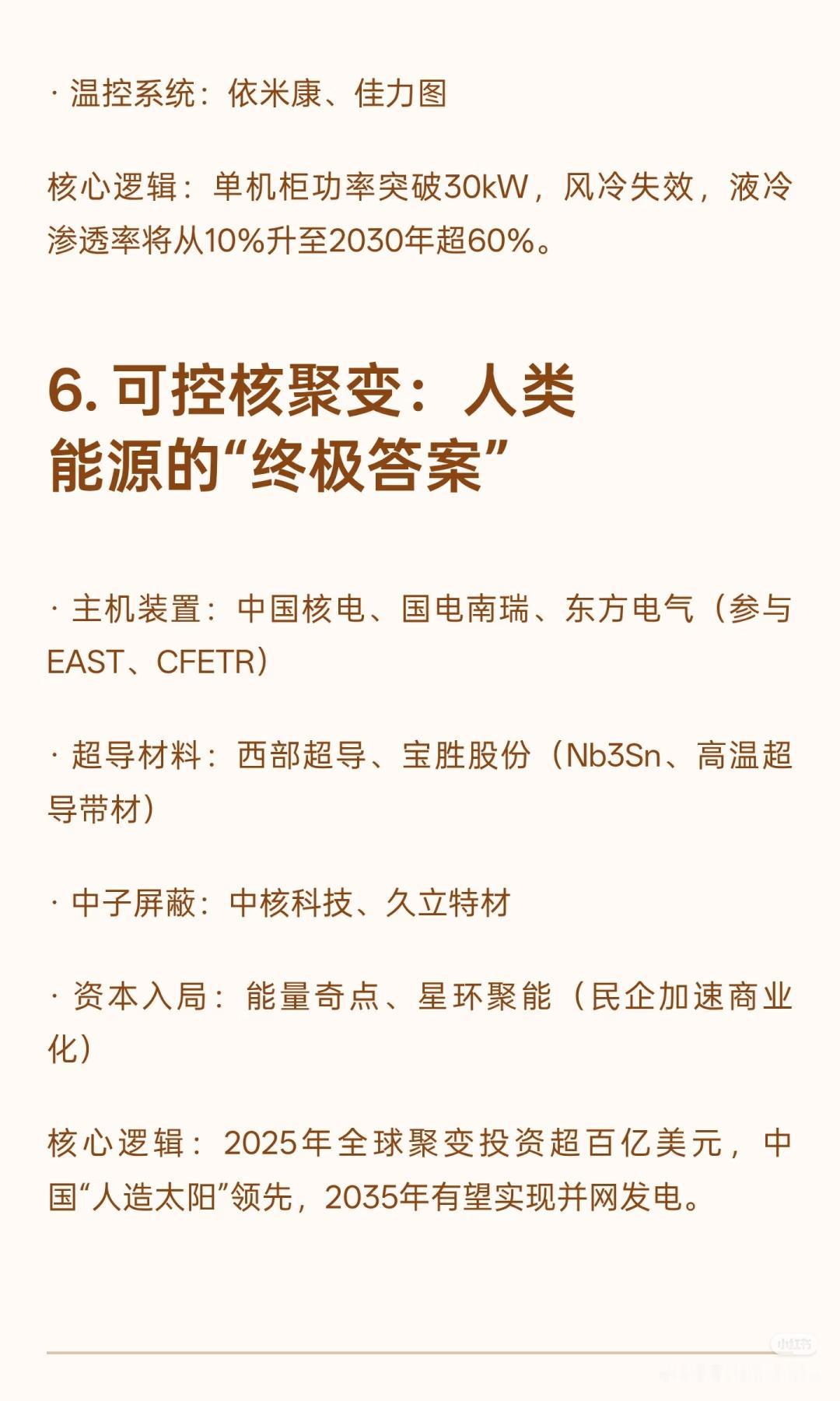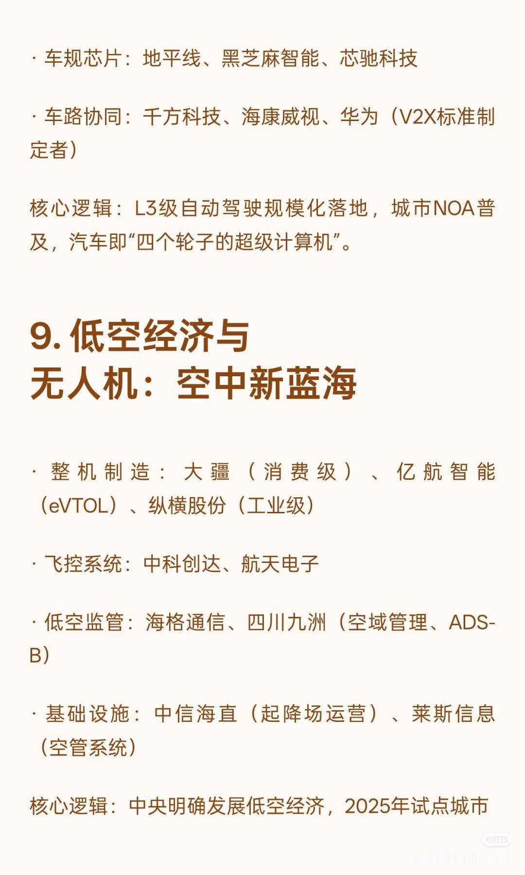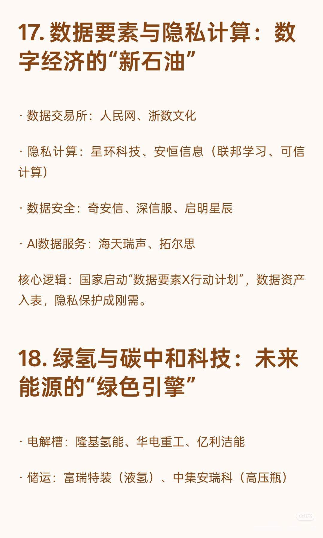 【未来18大高潜力科技赛道】,覆盖人工智能、量子科技、高端制造、新能源、生物技术、空天科技、数字化基础设施等多个前沿领域,每个赛道都明确了关键技术、代表企业及核心发展逻辑,体现出科技自立自强、国产替代加速、新兴产业爆发三大主线。以下是对这18大赛道的清晰归纳与总结: 一、人工智能与泛化智能(赛道1) - 核心方向:从算力底座(芯片、散热、互联)到大模型算法与多模态应用 - 关键企业:寒武纪(GPU)、中际旭创(光模块)、科大讯飞(大模型)、商汤科技 - 核心逻辑:全栈布局,AI从底座硬件到上层应用全面爆发 二、量子科技(赛道4 & 2部分) 1. 量子计算 - 企业:国盾量子、本源量子、中科曙光 - 路线:超导/光量子 - 核心逻辑:突破算力天花板,中国加速追赶国际前沿 2. 量子通信 - 企业:国盾量子、浙江东方、国电南瑞 - 项目:京沪干线、星地一体 - 核心逻辑:中国通信领域全球领先 3. 量子精密测量 - 企业:国仪量子 - 设备:磁力仪、重力仪 - 核心逻辑:量子技术为国家战略级“无人区”,中国积极布局 三、半导体国产替代(赛道2) - 关键环节全覆盖:设备(北方华创、中微公司)、材料(沪硅产业、安集科技)、EDA(华大九天)、先进封装(长电科技)、CPU/GPU(龙芯中科、海光信息) - 核心逻辑:硬科技攻坚,解决“卡脖子”,实现全链自主可控 四、人形机器人(赛道3) - 核心组件与企业: - 关节模组:三花智控、拓普集团 - 减速器:双环传动、绿的谐波 - 伺服系统:汇川技术、雷赛智能 - 机器视觉:奥普特、天准科技、科大讯飞 - AI大脑:华为、百度、优必选 - 核心逻辑:特斯拉Optimus量产在即,2030年或达百万台规模 五、液冷与先进散热(赛道5部分) - 技术路线:浸没式(英维克、高澜股份)、冷板式(工业富联、曙光数创) - 核心逻辑:AI算力爆发,液冷成为“生命线”,渗透率快速提升 六、可控核聚变(赛道5) - 关键布局: - 主机装置:中国核电、东方电气、国电南瑞(参与EAST、CFETR) - 超导材料:西部超导、宝胜股份 - 中子屏蔽:中核科技、久立特材 - 民企力量:能量奇点、星环聚能 - 核心逻辑:2035年有望并网发电,中国“人造太阳”全球领先 七、脑机接口(赛道6部分) - 侵入式:脑虎科技、博睿康 - 非侵入式:科大讯飞、强脑科技 - 应用场景:乐普医疗(神经疾病)、天智航(手术联动) - 核心逻辑:医疗康复为首要落地场景,中国“脑计划”加速 八、智能汽车(赛道6部分) - 智能座舱:华阳集团、德赛西威、均胜电子 - 自动驾驶:华为(ADS 3.0)、小鹏(XNGP)、禾赛科技(激光雷达) - 核心逻辑:从电动化迈向智能化,汽车成为“四个轮子的超级计算机” 九、低空经济与无人机(赛道7) - 整机:大疆(消费级)、亿航智能(eVTOL)、纵横股份(工业级) - 飞控:中科创达、航天电子 - 监管与基建:海格通信、莱斯信息 - 核心逻辑:中央明确支持,2025年试点城市启动,低空经济成新蓝海 十、新能源储能(赛道8) - 技术路线与代表企业: - 新型电池:宁德时代(钠离子)、鹏辉能源 - 液流电池:大连融科、伟创新能 - 压缩空气:陕鼓动力、金通灵 - 储能变流器:阳光电源、科华数据 - 智能电网:国电南瑞、南网科技 - 核心逻辑:2025年装机超50GW,长时储能成刚需 十一、生物科技与基因编辑(赛道9) 1. 基因编辑 - 企业:华大基因、诺禾致源(CRISPR平台) - 核心逻辑:FDA已批疗法,中国基因药进入商业化元年 2. 细胞治疗 - 企业:药明巨诺、传奇生物(CAR-T)、北陆药业(NK细胞) 3. 合成生物学 - 企业:凯赛生物、华恒生物(生物制造替代化工) 4. mRNA疫苗 - 企业:石药集团、沃森生物、艾博生物 - 核心逻辑:精准医疗重塑医疗范式 十二、元宇宙与Web3.0(赛道9部分) - 硬件:歌尔股份、Pico、创维数字 - 数字孪生:宝信软件、能科科技 - 空间计算:虹软科技、中海达 - 底层技术:人民网(区块链)、安妮股份(数字版权) - 核心逻辑:苹果Vision Pro引领空间计算,工业元宇宙先行 十三、商业航天(赛道13) - 细分领域与企业: - 火箭发射:星际荣耀、星河动力、中科宇航 - 卫星制造:中国卫星、欧比特、天银机电 - 卫星互联网:中国卫通、信科移动 - 地面设备:海格通信、华力创通 - 核心逻辑:2025年进入密集发射期,中国“GW星座”对标“星链”