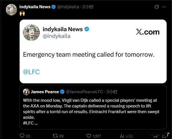 皮尔斯透露在球队情绪低迷之际,范戴克周一在安盛训练中心召集了一场特殊球员会议。这位队长用振奋人心的讲话重振全队士气,随后利物浦便在比赛中横扫法兰克福队。