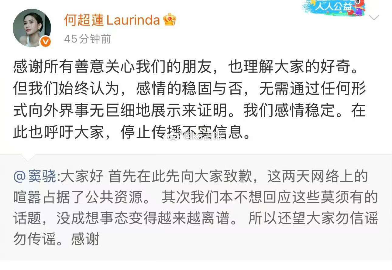 何超莲转发窦骁博文:感谢所有善意关心我们的朋友,也理解大家的好奇。但我们始终认为,感情的稳固与否,无需通过任何形式向外界事无巨细地展示来证明。我们感情稳定。在此也呼吁大家,停止传播不实信息。窦骁发文回应何超莲表示和窦骁感情稳定窦骁回应传闻称勿信谣传谣