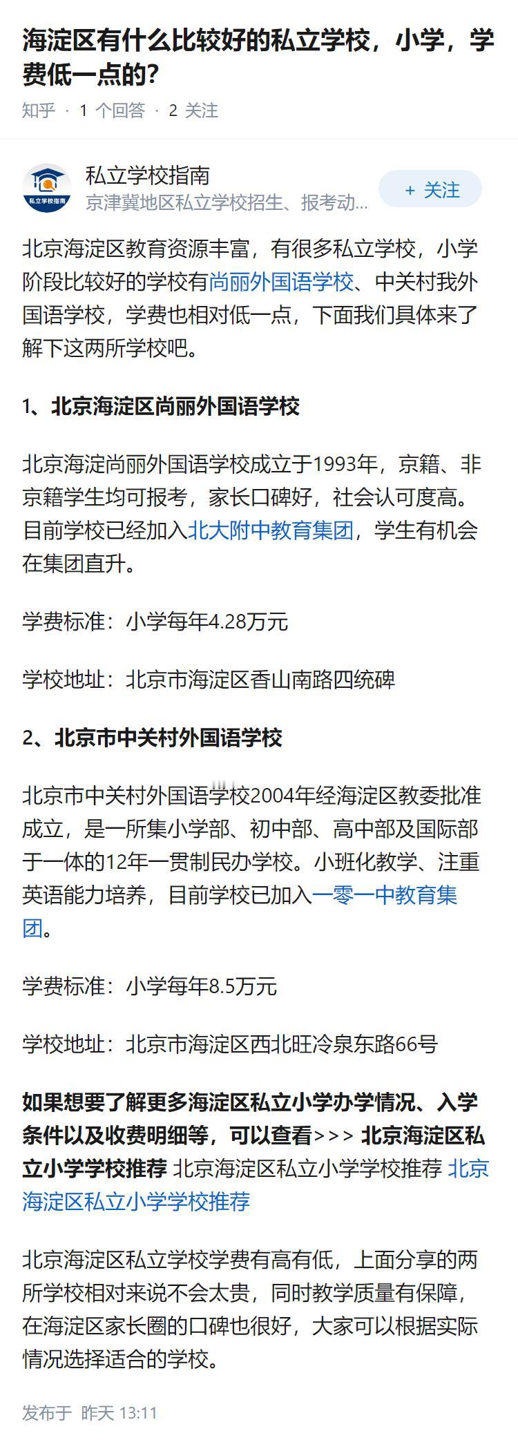 海淀区有什么比较好的私立学校,小学,学费低一点的?
