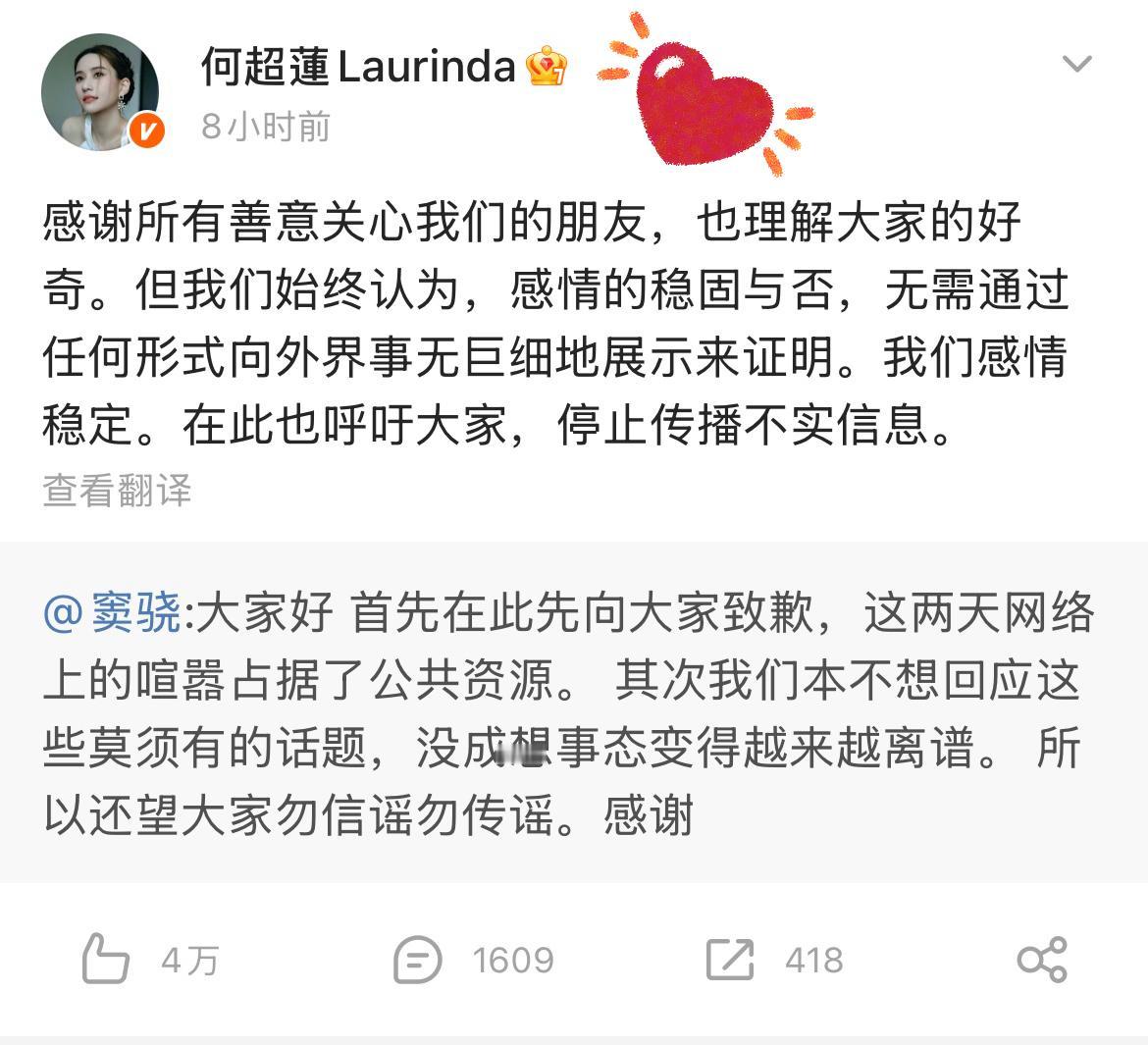 我的天呐! 我以为向太会出来道歉! 万万没想到, 居然是窦骁两口子! 这次主动出面回应传闻的先是窦骁,何超莲紧随其后发文感谢关心,小两口这波操作直接打破了所有分手猜测。 其实他们一直感情稳定,只是近期各自专注事业才显得低调。 超莲说得特别得体,理解大家的好奇,但感情毕竟是私事。 据说三太确实舍不得女儿,对窦骁有过观望期,但现在连"组建足球队"的计划都提上日程了。 看窦骁每次望向超莲的眼神就知道,能时刻照顾女友情绪的男人确实难得。 要我说啊,这对CP根本不用向谁证明什么,人家关起门来的甜蜜我们想象不到。 等着吧,估计很快就能听到他们的好消息了!