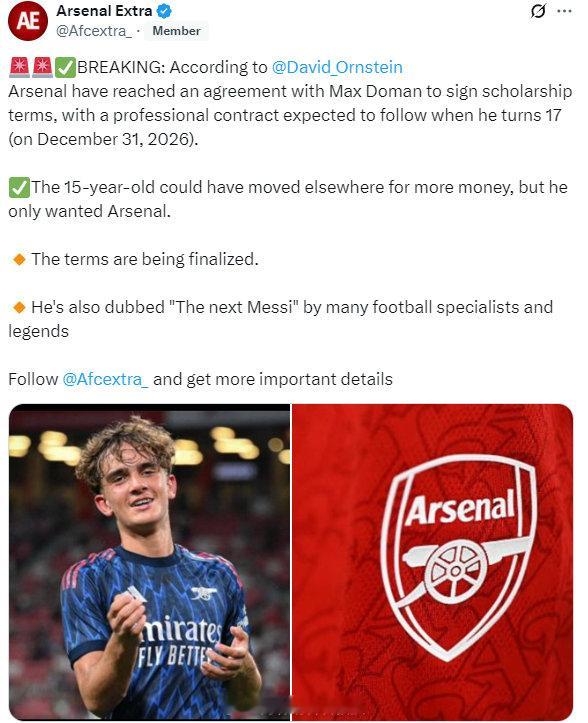 阿森纳与道曼就签署学徒合同达成协议,预计在他年满17岁时(2026 年 12 月 31 日)签订职业合同。这位15岁的球员本可以转会到其他地方赚取更多钱,但他只想要阿森纳。相关条款正在最终确定中。他也被许多足球专家和传奇人物称为“下一个梅西” 金秋观赛季 阿森纳著名教授