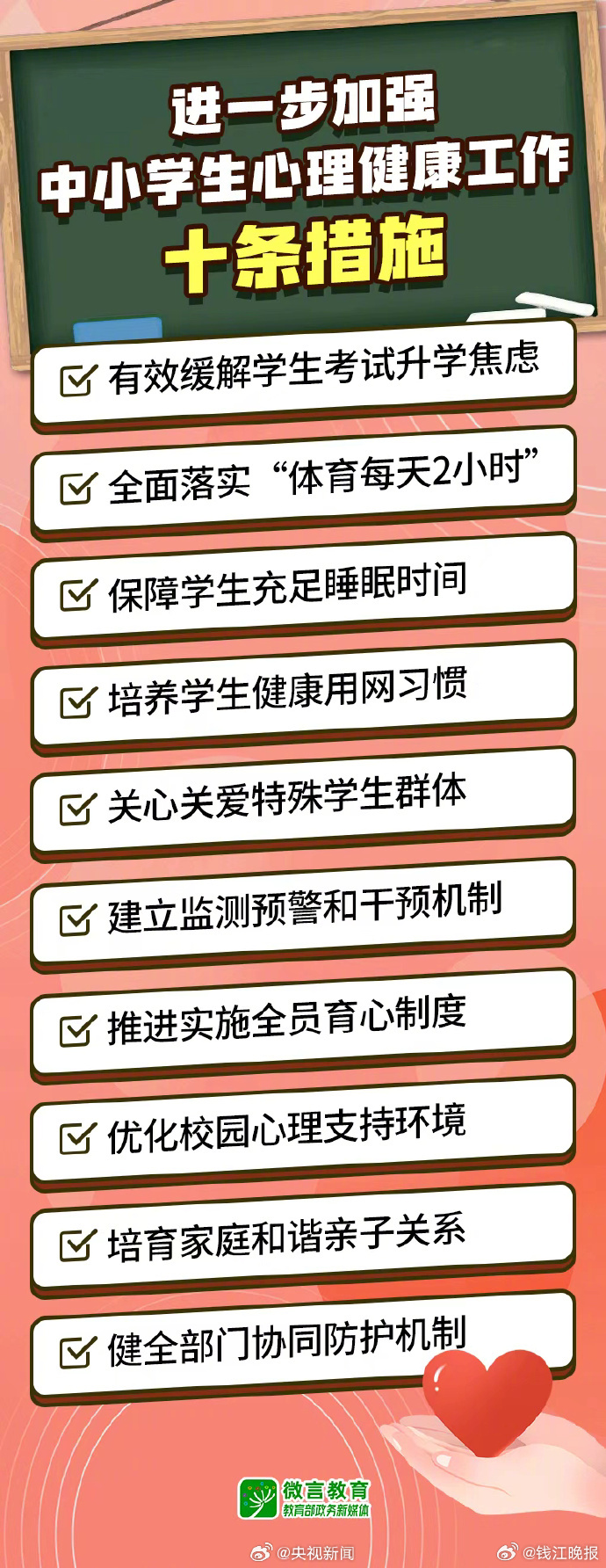 【教育部:#加强中小学生心理健康10条措施#】#全国学生心理健康监测预警系统# 近日,教育部办公厅印发通知,提出进一步加强中小学生心理健康工作十条措施,全面提升中小学生心理素质,促进健康成长。其中包括: