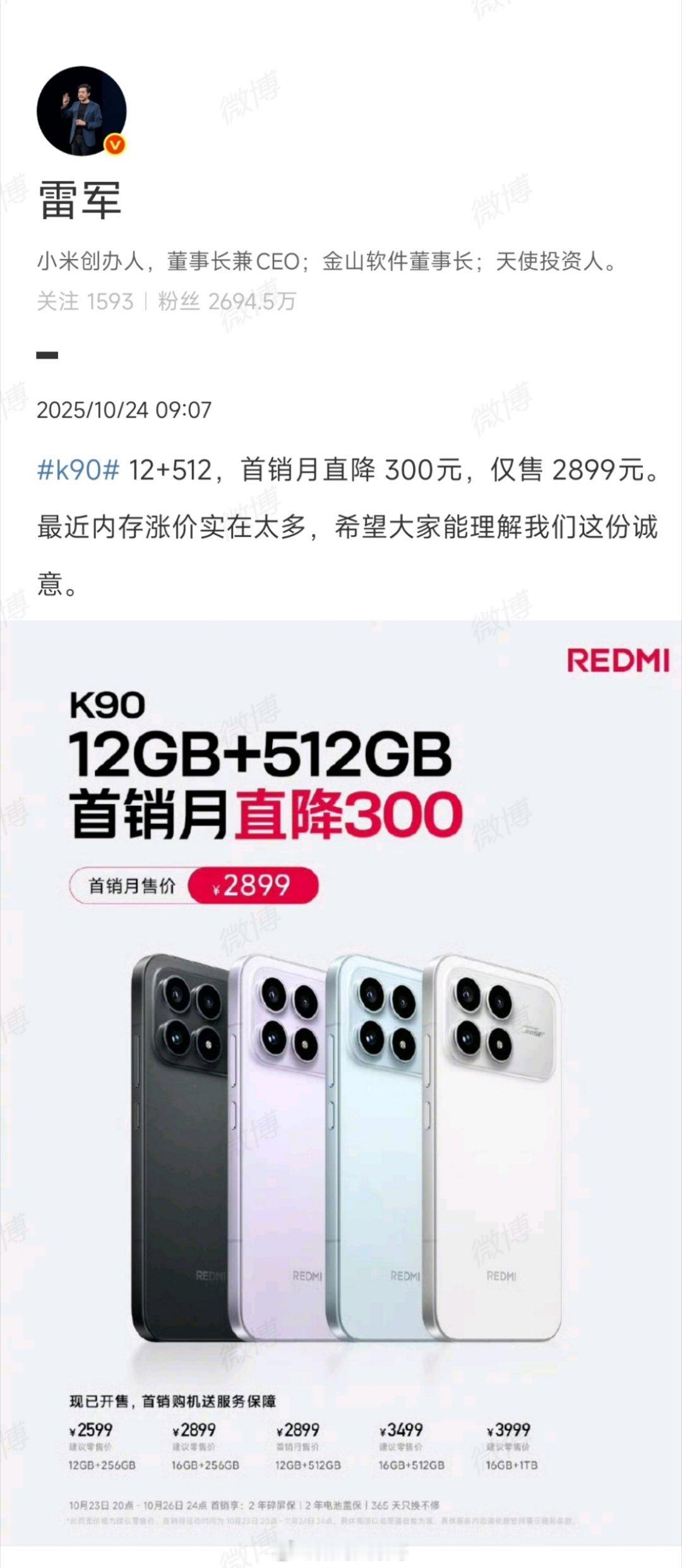 雷军回应K90定价内存涨价挡不住宠粉!雷军发文K90首销月12+512直降30