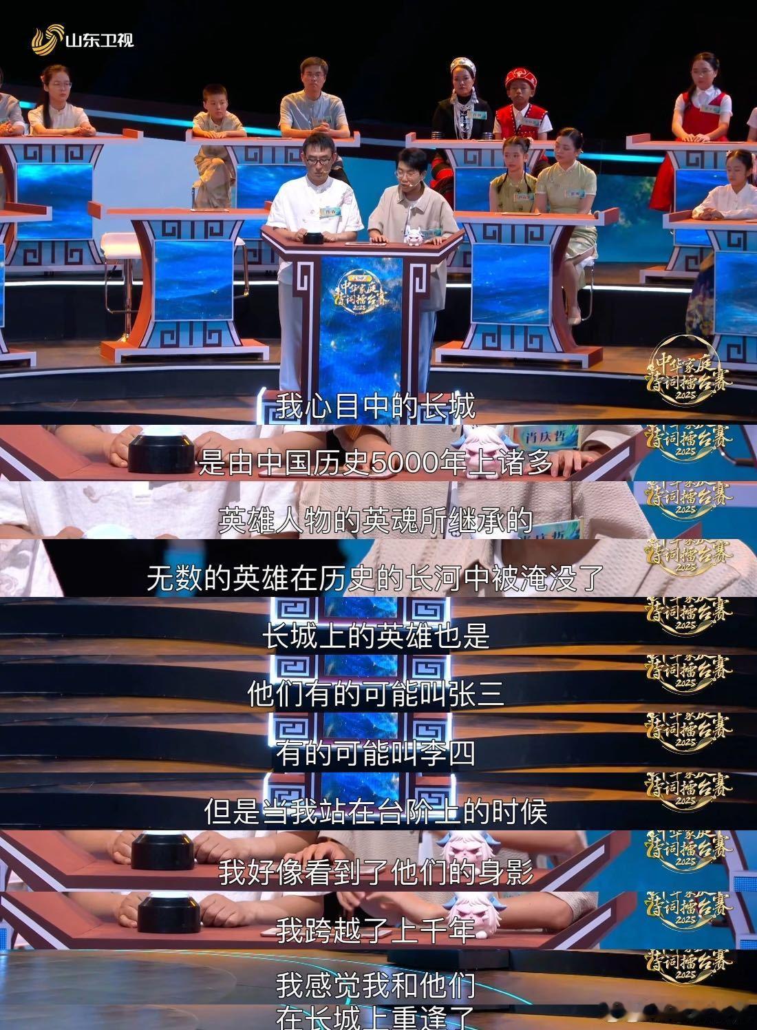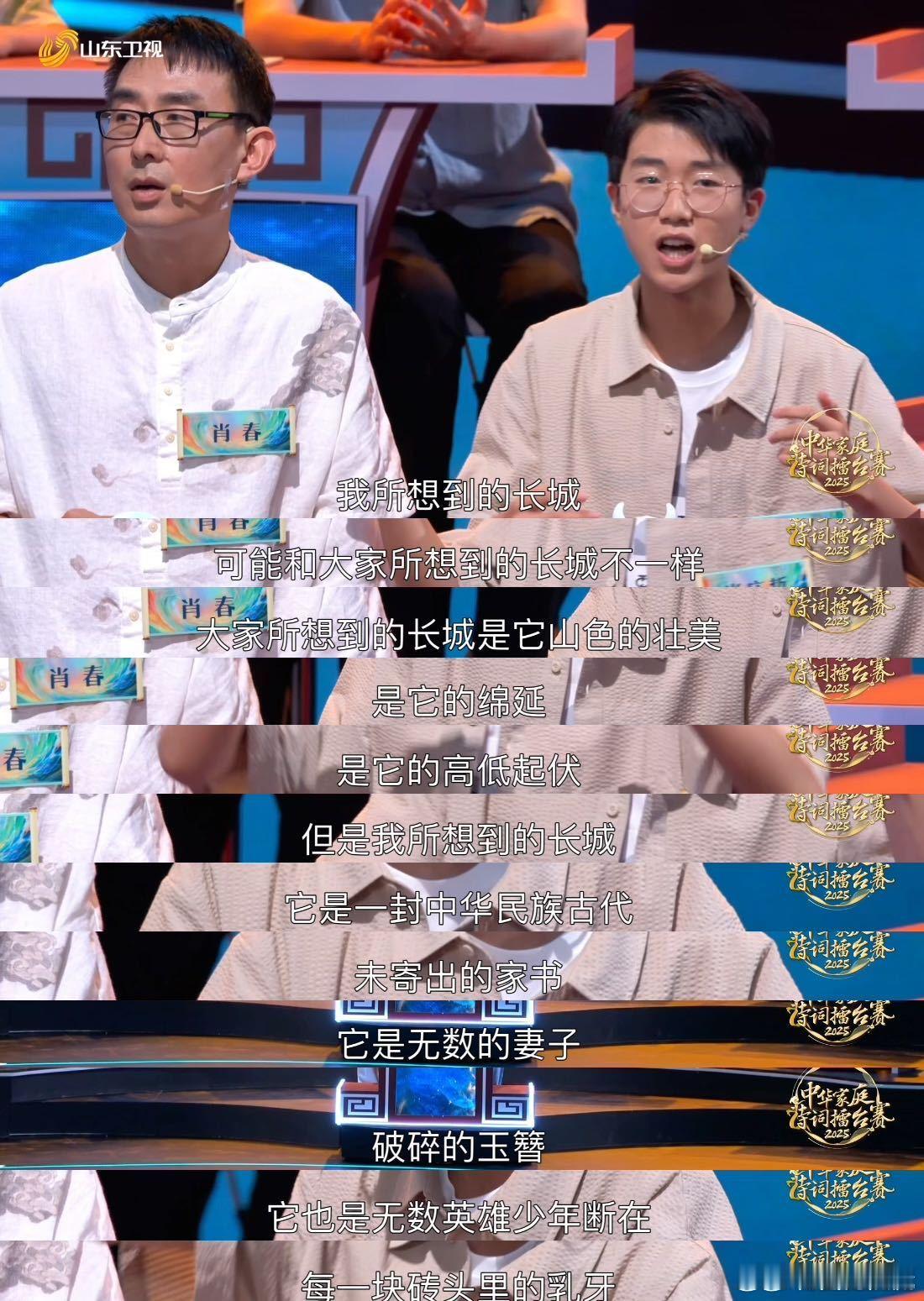 《中华家庭诗词擂台赛》上,一位少年的发言颠覆了所有人对长城的认知。他不讲工程奇迹,只提居庸关少年烈士的自刎,说长城浸着血腥味。那句“只要中国少年还在,长城就不会倒”,让人瞬间泪目。
