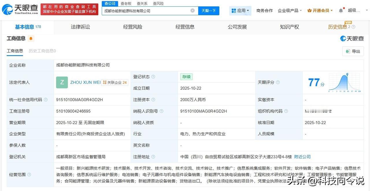 【协能科技在成都成立新能源科技公司注册资本2000万】 天眼查App显示,近日